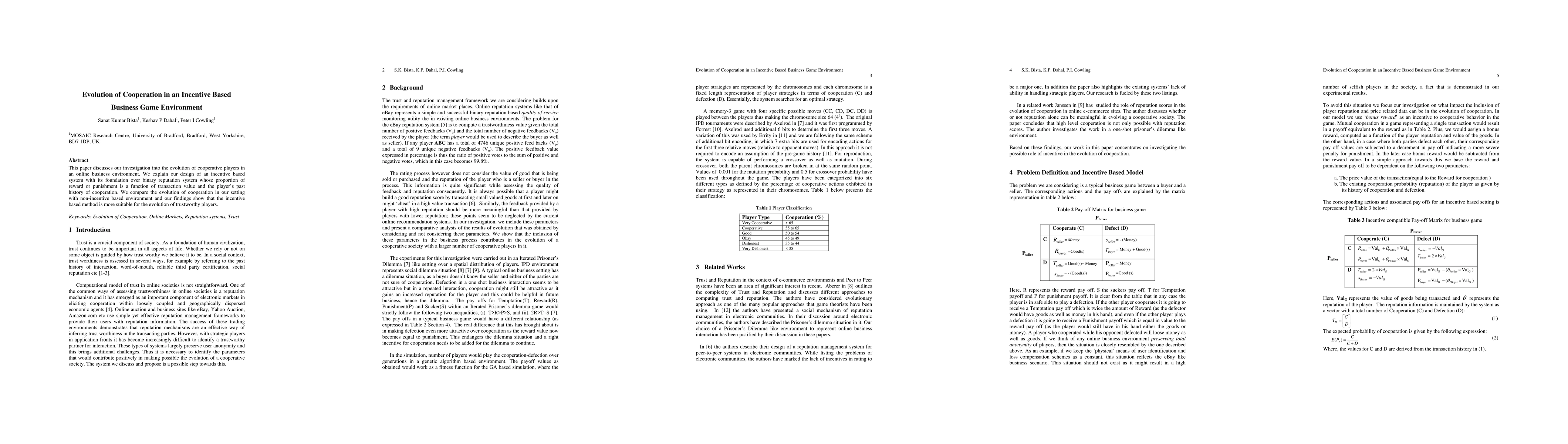 This paper discusses our investigation into the evolution of cooperative players in an online business environment. We explain our design of an incentive based system with its foundation over binary reputation system whose proportion of reward or punishment is a function of transaction value and the players past history of cooperation. We compare the evolution of cooperation in our setting with non-incentive based environment and our findings show that the incentive based method is more suitable for the evolution of trustworthy players.