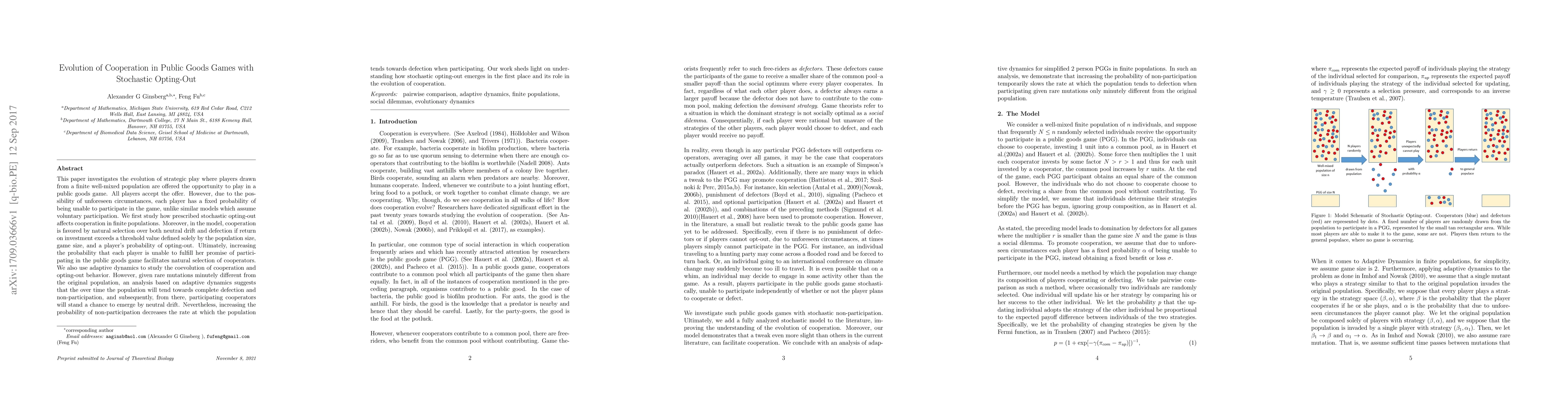 This paper investigates the evolution of strategic play where players drawn from a finite well-mixed population are offered the opportunity to play in a public goods game. All players accept the offer. However, due to the possibility of unforeseen circumstances, each player has a fixed probability of being unable to participate in the game, unlike similar models which assume voluntary participation. We first study how prescribed stochastic opting-out affects cooperation in finite populations. Moreover, in the model, cooperation is favored by natural selection over both neutral drift and defection if return on investment exceeds a threshold value defined solely by the population size, game size, and a player's probability of opting-out. Ultimately, increasing the probability that each player is unable to fulfill her promise of participating in the public goods game facilitates natural selection of cooperators. We also use adaptive dynamics to study the coevolution of cooperation and opting-out behavior. However, given rare mutations minutely different from the original population, an analysis based on adaptive dynamics suggests that the over time the population will tend towards complete defection and non-participation, and subsequently, from there, participating cooperators will stand a chance to emerge by neutral drift. Nevertheless, increasing the probability of non-participation decreases the rate at which the population tends towards defection when participating. Our work sheds light on understanding how stochastic opting-out emerges in the first place and its role in the evolution of cooperation.