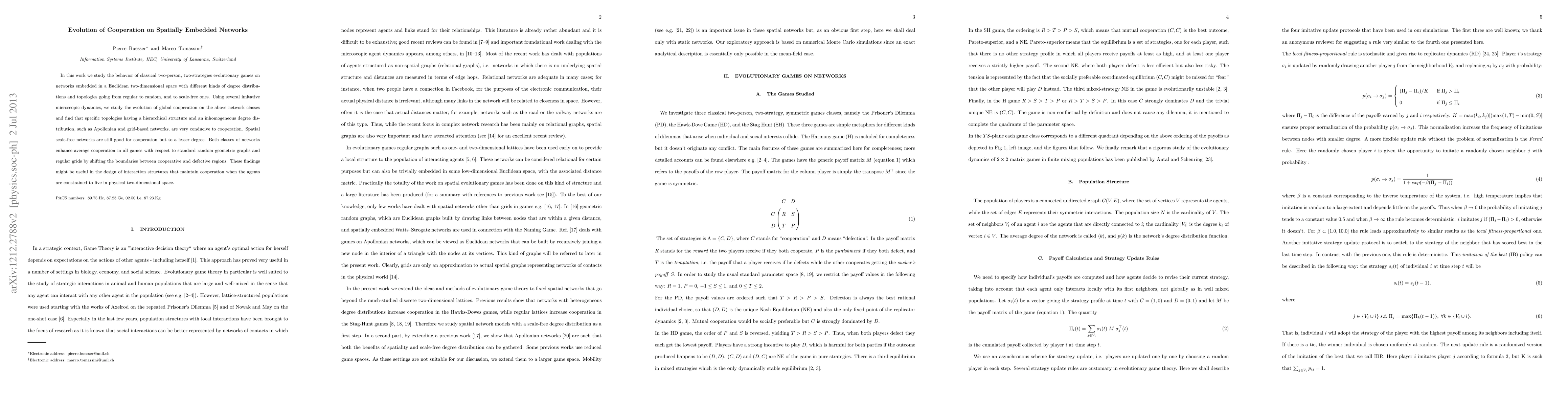 In this work we study the behavior of classical two-person, two-strategies evolutionary games on networks embedded in a Euclidean two-dimensional space with different kinds of degree distributions and topologies going from regular to random, and to scale-free ones. Using several imitative microscopic dynamics, we study the evolution of global cooperation on the above network classes and find that specific topologies having a hierarchical structure and an inhomogeneous degree distribution, such as Apollonian and grid-based networks, are very conducive to cooperation. Spatial scale-free networks are still good for cooperation but to a lesser degree. Both classes of networks enhance average cooperation in all games with respect to standard random geometric graphs and regular grids by shifting the boundaries between cooperative and defective regions. These findings might be useful in the design of interaction structures that maintain cooperation when the agents are constrained to live in physical two-dimensional space.