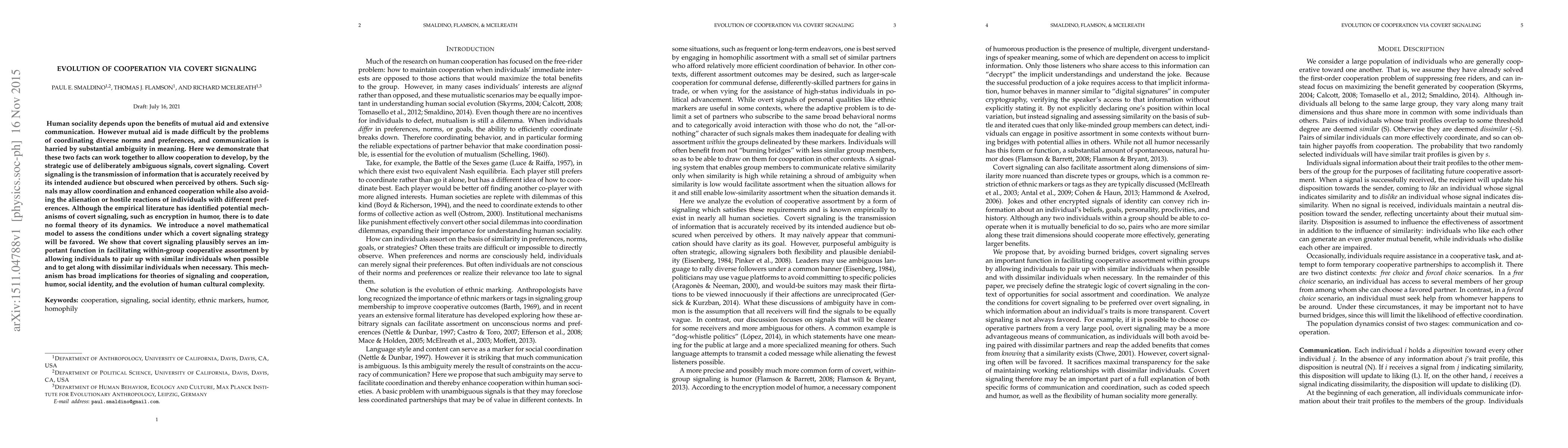 This paper introduces a mathematical model to explore how covert signaling—deliberately ambiguous signals accurately understood by intended recipients—can facilitate cooperation among individuals with diverse norms and preferences. It demonstrates that covert signaling can enhance within-group cooperation by enabling individuals to coordinate while minimizing alienation from those with different preferences.