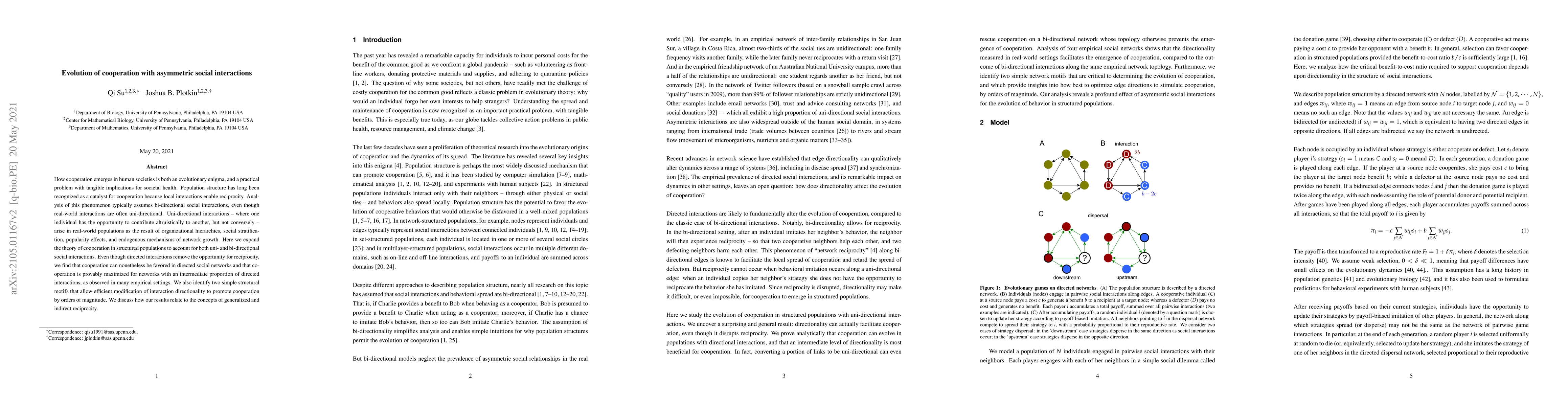 This paper explores how cooperation can emerge in human societies through both bi-directional and uni-directional social interactions, demonstrating that cooperation can thrive even in asymmetric networks. It identifies structural motifs that enhance cooperation and discusses implications for generalized and indirect reciprocity.