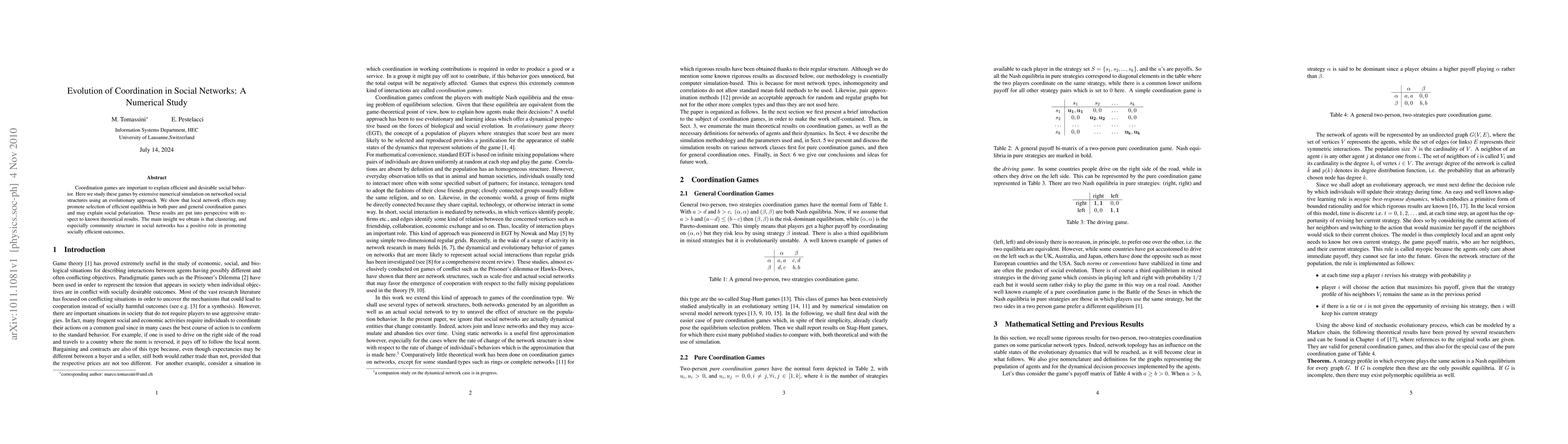 This paper uses numerical simulations to explore how evolutionary processes in coordination games on social networks lead to efficient equilibria and social polarization. The study finds that clustering and community structures in networks significantly enhance the likelihood of socially efficient outcomes.