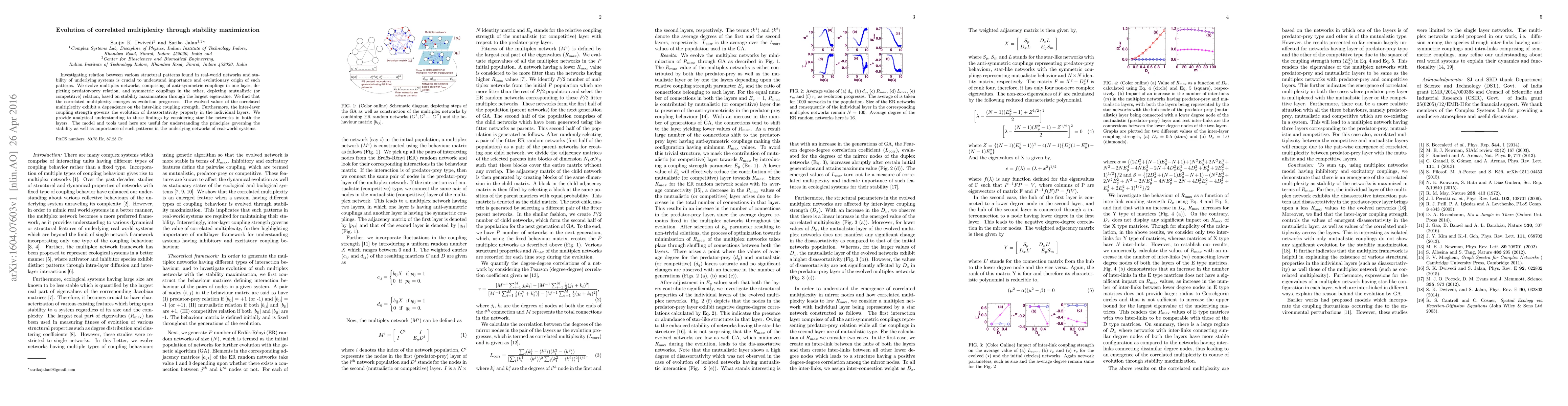 Investigating relation between various structural patterns found in real-world networks and stability of underlying systems is crucial to understand importance and evolutionary origin of such patterns. We evolve multiplex networks, comprising of anti-symmetric couplings in one layer, depicting predator-prey relation, and symmetric couplings in the other, depicting mutualistic (or competitive) relation, based on stability maximization through the largest eigenvalue. We find that the correlated multiplexity emerges as evolution progresses. The evolved values of the correlated multiplexity exhibit a dependence on the inter-link coupling strength. Furthermore, the inter-layer coupling strength governs the evolution of disassortativity property in the individual layers. We provide analytical understanding to these findings by considering star like networks in both the layers. The model and tools used here are useful for understanding the principles governing the stability as well as importance of such patterns in the underlying networks of real-world systems.