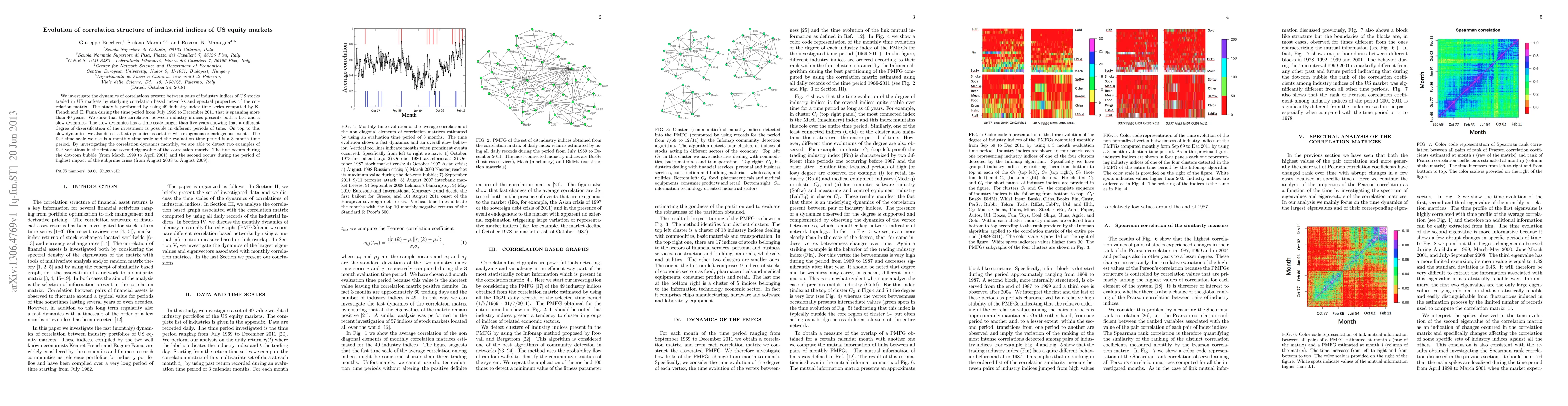 We investigate the dynamics of correlations present between pairs of industry indices of US stocks traded in US markets by studying correlation based networks and spectral properties of the correlation matrix. The study is performed by using 49 industry index time series computed by K. French and E. Fama during the time period from July 1969 to December 2011 that is spanning more than 40 years. We show that the correlation between industry indices presents both a fast and a slow dynamics. The slow dynamics has a time scale longer than five years showing that a different degree of diversification of the investment is possible in different periods of time. On top to this slow dynamics, we also detect a fast dynamics associated with exogenous or endogenous events. The fast time scale we use is a monthly time scale and the evaluation time period is a 3 month time period. By investigating the correlation dynamics monthly, we are able to detect two examples of fast variations in the first and second eigenvalue of the correlation matrix. The first occurs during the dot-com bubble (from March 1999 to April 2001) and the second occurs during the period of highest impact of the subprime crisis (from August 2008 to August 2009).