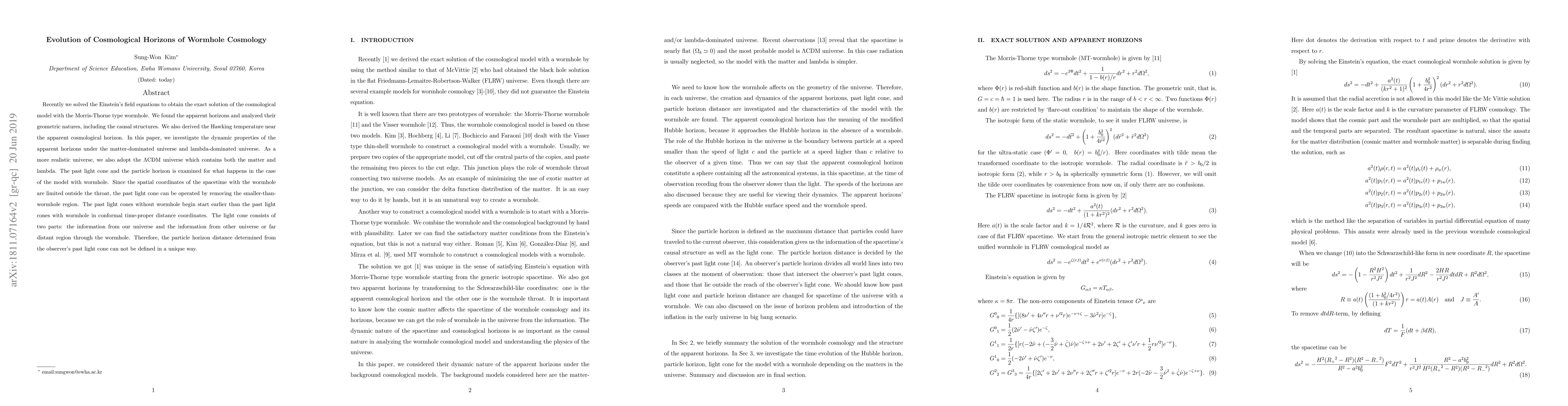 Recently we solved the Einstein's field equations to obtain the exact solution of the cosmological model with the Morris-Thorne type wormhole. We found the apparent horizons and analyzed their geometric natures, including the causal tructures. We also derived the Hawking temperature near the apparent cosmological horizon with a proper definition of the Kodama vector. In this paper, we investigate the dynamic properties of the apparent horizons according to the distribution of cosmic matter. The matter-, radiation-, and lambda-dominated universes are considered as a single component universe. As a multi-component universe, we adopt the $\Lambda$CDM universe which contains the matter and lambda. We also considered the speeds of apparent horizons and compared them with those of the universe without wormhole. The past light cone and the particle horizon is examined for what happens in the case of model with wormhole. Since the spatial coordinates of the spacetime with the wormhole are limited outside the throat, the past light cone can be operated by removing the smaller-than-wormhole region. The past light cones without wormhole begin start earlier than the past light cones with wormhole in conformal time-proper distance coordinates. The travel-through-wormhole can shows different part from normal one. Therefore, the particle horizon distance determined from the observer's past light cone can not be defined in a unique way. The case of the travel-through-wormhole can be extended into another universe or far distant causally disconnected region.