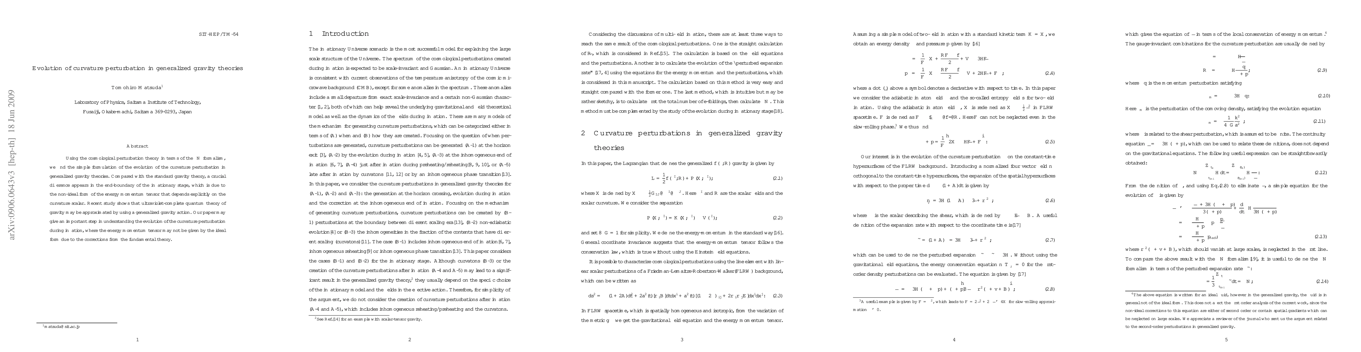 Using the cosmological perturbation theory in terms of the delta-N formalism, we find the simple formulation of the evolution of the curvature perturbation in generalized gravity theories. Compared with the standard gravity theory, a crucial difference appears in the end-boundary of the inflationary stage, which is due to the non-ideal form of the energy momentum tensor that depends explicitly on the curvature scalar. Recent study shows that ultraviolet-complete quantum theory of gravity may be approximated by using a generalized gravity action. Our paper may give an important step in understanding the evolution of the curvature perturbation during inflation, where the energy momentum tensor may not be given by the ideal form due to the corrections from the fundamental theory.
