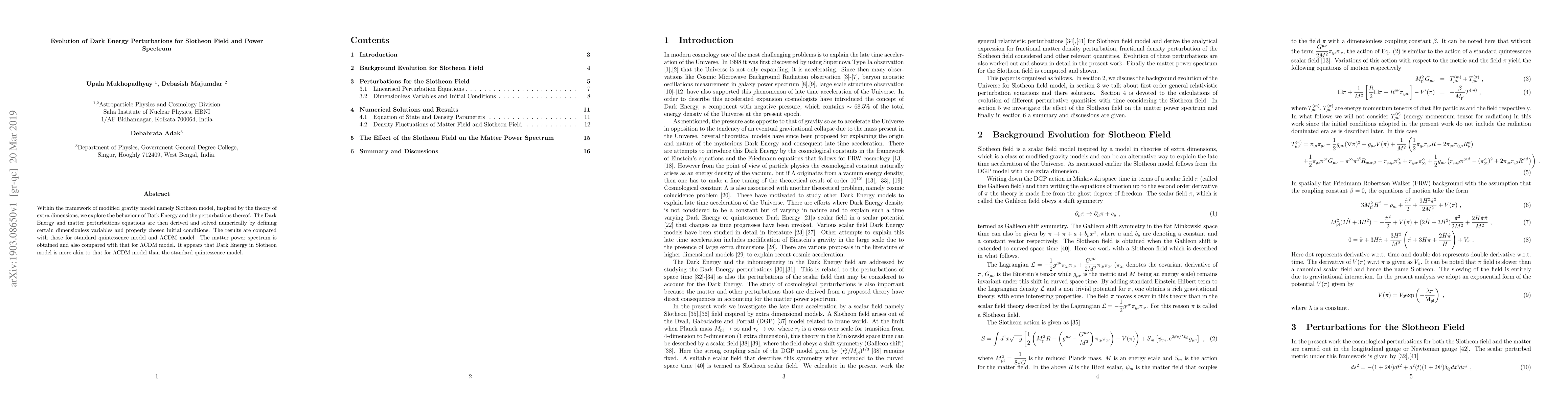 Within the framework of modified gravity model namely Slotheon model, inspired by the theory of extra dimensions, we explore the behaviour of Dark Energy and the perturbations thereof. The Dark Energy and matter perturbations equations are then derived and solved numerically by defining certain dimensionless variables and properly chosen initial conditions. The results are compared with those for standard quintessence model and $\Lambda$CDM model. The matter power spectrum is obtained and also compared with that for $\Lambda$CDM model. It appears that Dark Energy in Slotheon model is more akin to that for $\Lambda$CDM model than the standard quintessence model.