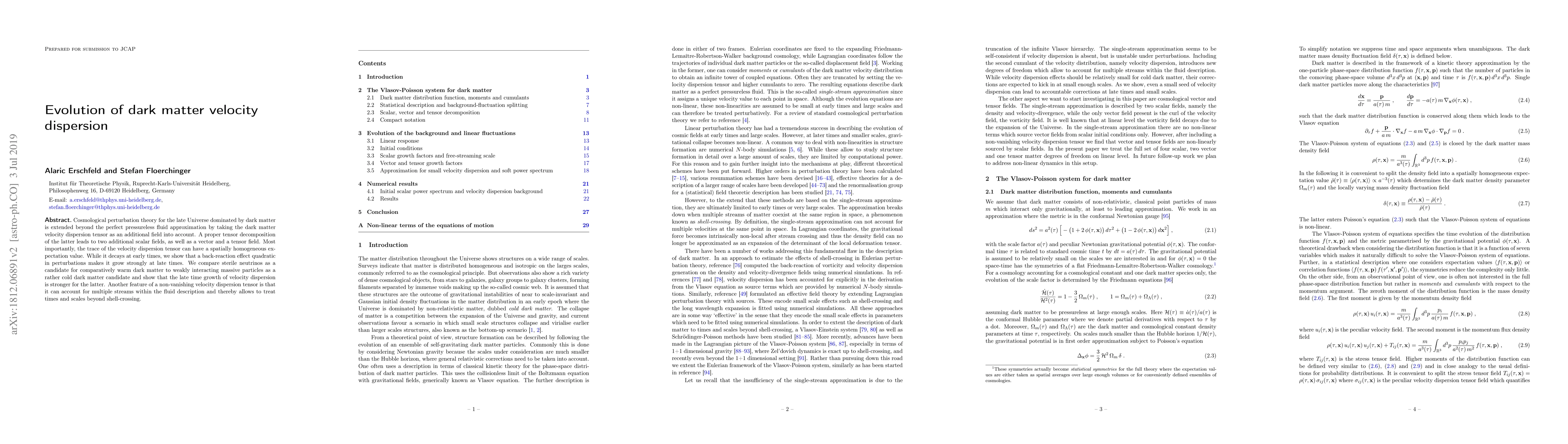 This paper extends cosmological perturbation theory to include the dark matter velocity dispersion tensor, revealing its decomposition into scalar, vector, and tensor fields. It demonstrates that while the trace of this tensor decays early on, it grows significantly at late times due to a back-reaction effect, with weakly interacting massive particles showing stronger growth compared to sterile neutrinos. This non-vanishing velocity dispersion also invalidates the single-stream approximation, enabling analysis beyond shell-crossing.