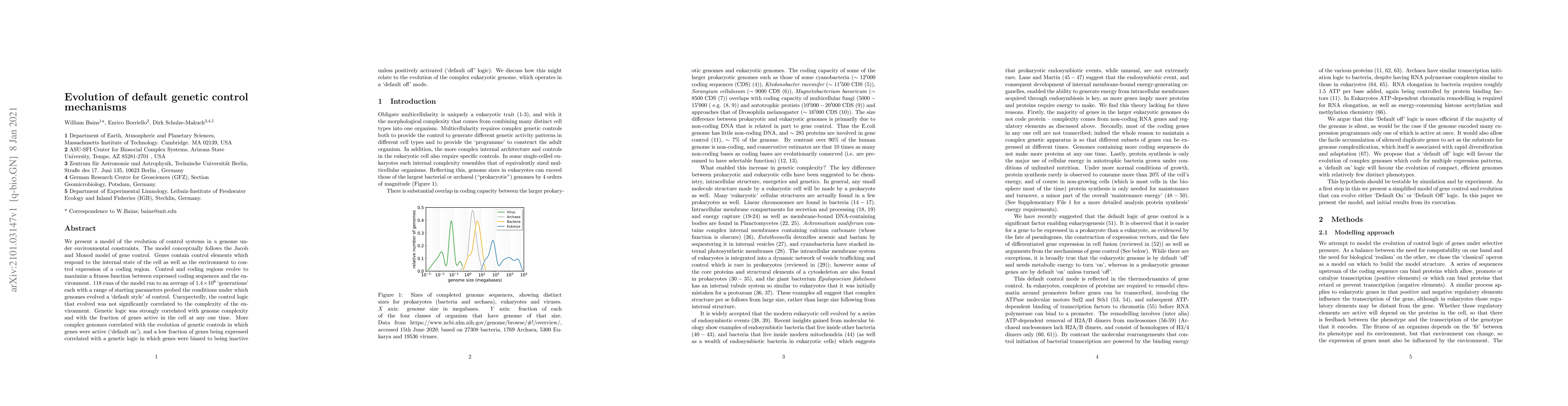 This research models the evolution of genetic control mechanisms under environmental constraints, finding that genome complexity and gene activity levels significantly influence the default genetic logic, with more complex genomes tending to a "default on" state, and simpler genomes favoring a "default off" state. The study suggests implications for the evolution of eukaryotic genomes.