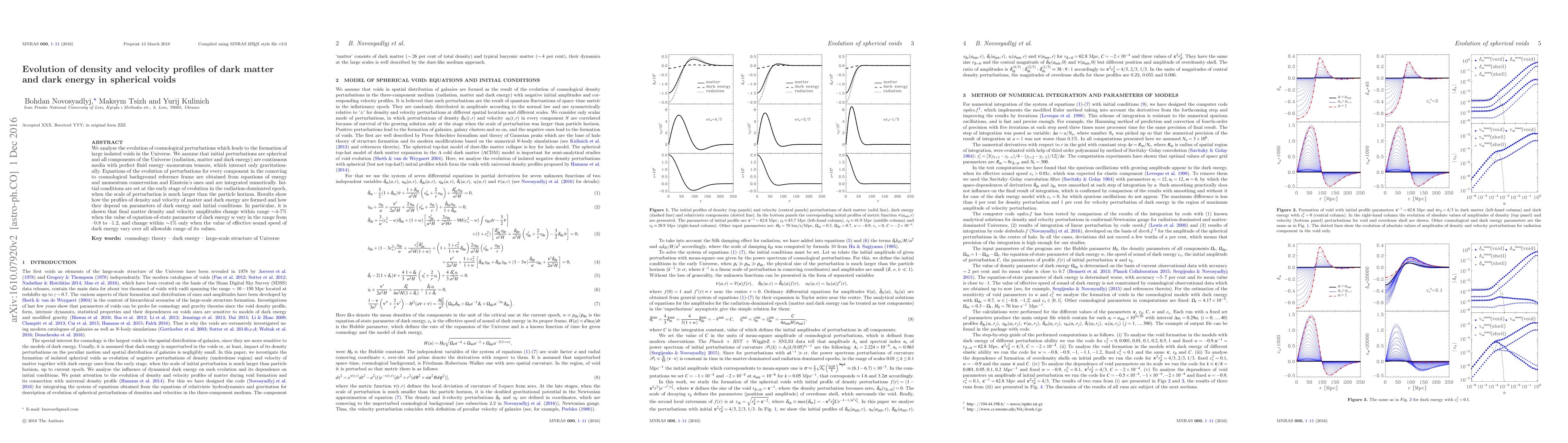 We analyse the evolution of cosmological perturbations which leads to the formation of large isolated voids in the Universe. We assume that initial perturbations are spherical and all components of the Universe (radiation, matter and dark energy) are continuous media with perfect fluid energy--momentum tensors, which interact only gravitationally. Equations of the evolution of perturbations for every component in the comoving to cosmological background reference frame are obtained from equations of energy and momentum conservation and Einstein's ones and are integrated numerically. Initial conditions are set at the early stage of evolution in the radiation-dominated epoch, when the scale of perturbation is much larger than the particle horizon. Results show how the profiles of density and velocity of matter and dark energy are formed and how they depend on parameters of dark energy and initial conditions. In particular, it is shown that final matter density and velocity amplitudes change within range $\sim$4-7\% when the value of equation-of-state parameter of dark energy $w$ vary in the range from --0.8 to --1.2, and change within $\sim$1\% only when the value of effective sound speed of dark energy vary over all allowable range of its values.
