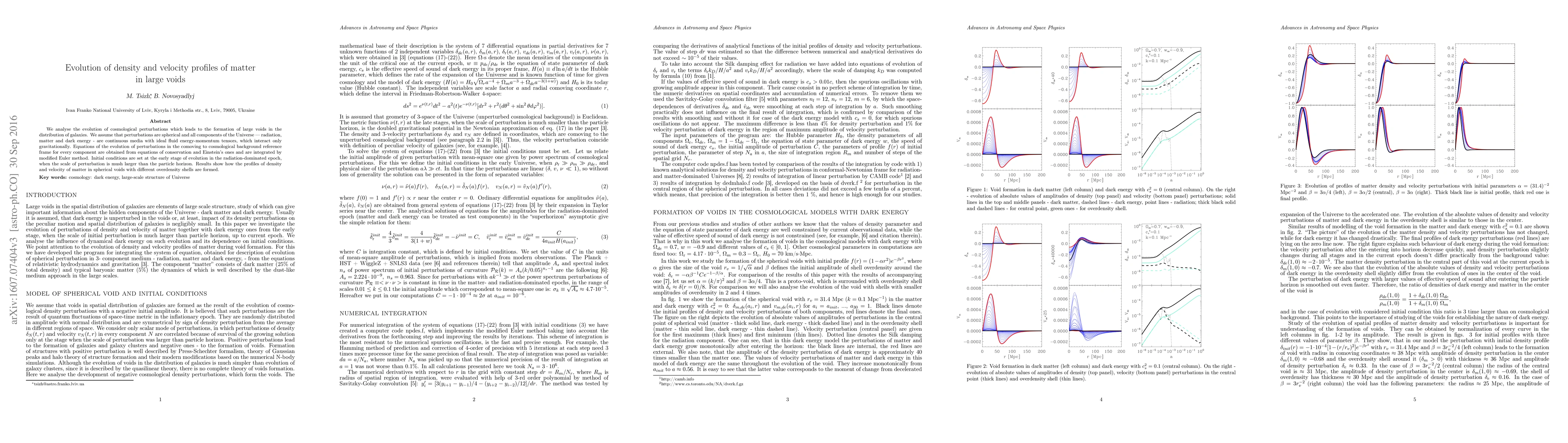 This paper investigates the formation and evolution of large voids in the universe by analyzing cosmological perturbations, assuming spherical perturbations and continuous media for radiation, matter, and dark energy. The study uses modified Euler integration to derive density and velocity profiles of matter within these voids, revealing their development from the early radiation-dominated epoch.