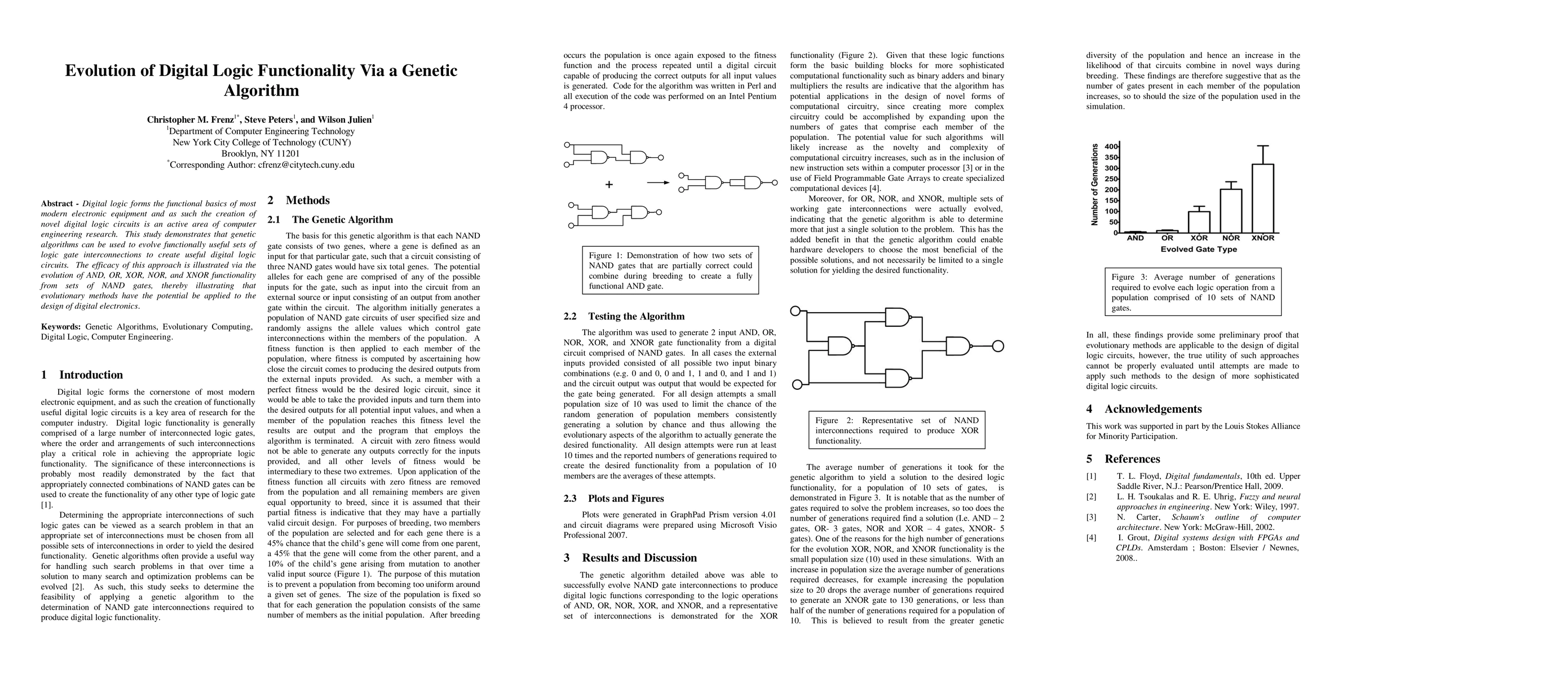 This study shows that genetic algorithms can evolve functional logic gates from NAND gate sets, demonstrating their potential for designing novel digital logic circuits. The effectiveness is highlighted by evolving AND, OR, XOR, NOR, and XNOR functions.
