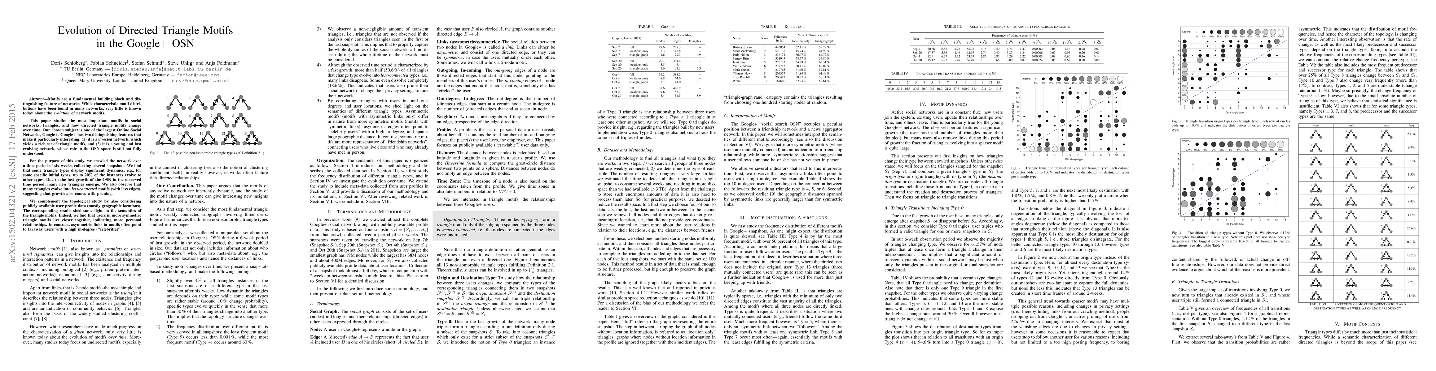 This paper investigates the dynamic evolution of directed triangle motifs in Google+, a large Online Social Network, over six weeks. It finds significant changes in triangle types, with up to 20% evolving, and observes both growth and pruning in the network. Additionally, it correlates motif symmetry with geographic proximity, revealing personal relationships in symmetric triangles and celebrity connections in asymmetric ones.