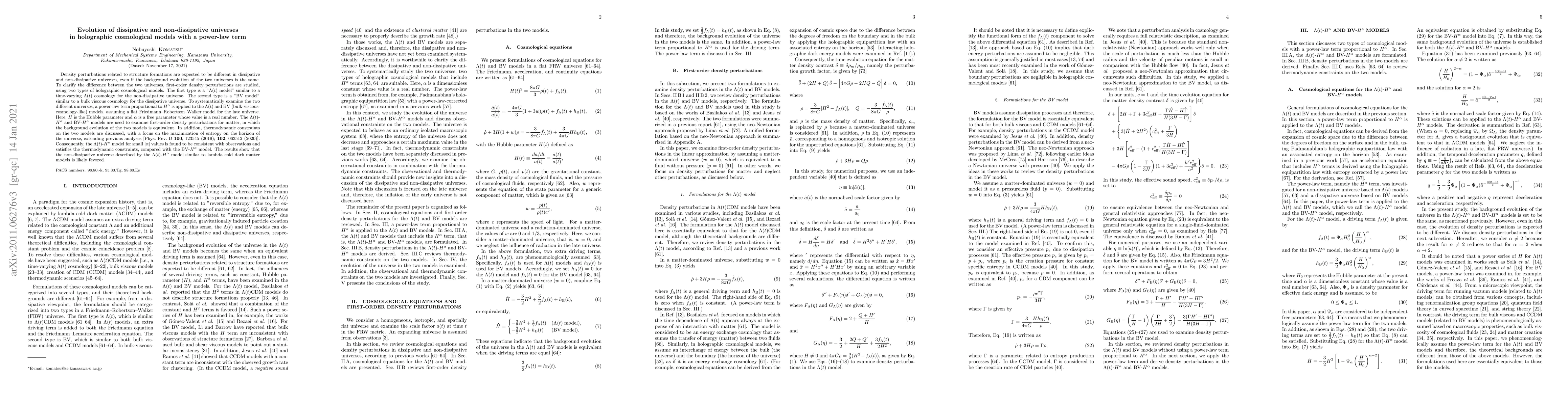 Density perturbations related to structure formations are expected to be different in dissipative and non-dissipative universes, even if the background evolution of the two universes is the same. To clarify the difference between the two universes, first-order density perturbations are studied, using two types of holographic cosmological models. The first type is a "$\Lambda(t)$ model" similar to a time-varying $\Lambda(t)$ cosmology for the non-dissipative universe. The second type is a "BV model" similar to a bulk viscous cosmology for the dissipative universe. To systematically examine the two different universes, a power-law term proportional to $H^{\alpha}$ is applied to the $\Lambda(t)$ and BV (bulk-viscous-cosmology-like) models, assuming a flat Friedmann--Robertson--Walker model for the late universe. Here, $H$ is the Hubble parameter and $\alpha$ is a free parameter whose value is a real number. The $\Lambda(t)$-$H^{\alpha}$ and BV-$H^{\alpha}$ models are used to examine first-order density perturbations for matter, in which the background evolution of the two models is equivalent. In addition, thermodynamic constraints on the two models are discussed, with a focus on the maximization of entropy on the horizon of the universe, extending previous analyses [Phys. Rev. D 100, 123545 (2019) (arXiv:1911.08306); 102, 063512 (2020) (arXiv:2006.09650)]. Consequently, the $\Lambda(t)$-$H^{\alpha}$ model for small $|\alpha|$ values is found to be consistent with observations and satisfies the thermodynamic constraints, compared with the BV-$H^{\alpha}$ model. The results show that the non-dissipative universe described by the $\Lambda(t)$-$H^{\alpha}$ model similar to lambda cold dark matter models is likely favored.