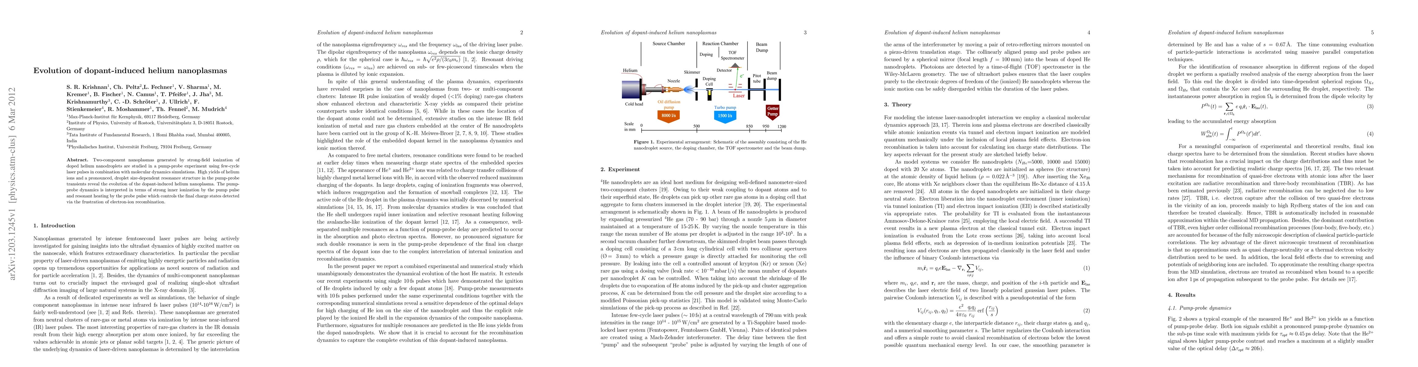 This study investigates the formation and evolution of dopant-induced helium nanoplasmas through strong-field ionization of helium nanodroplets, revealing high yields of helium ions and a resonance structure dependent on droplet size, interpreted via pump-probe dynamics and molecular dynamics simulations. The dynamics highlight the role of pump and probe pulses in controlling ionization and recombination processes.