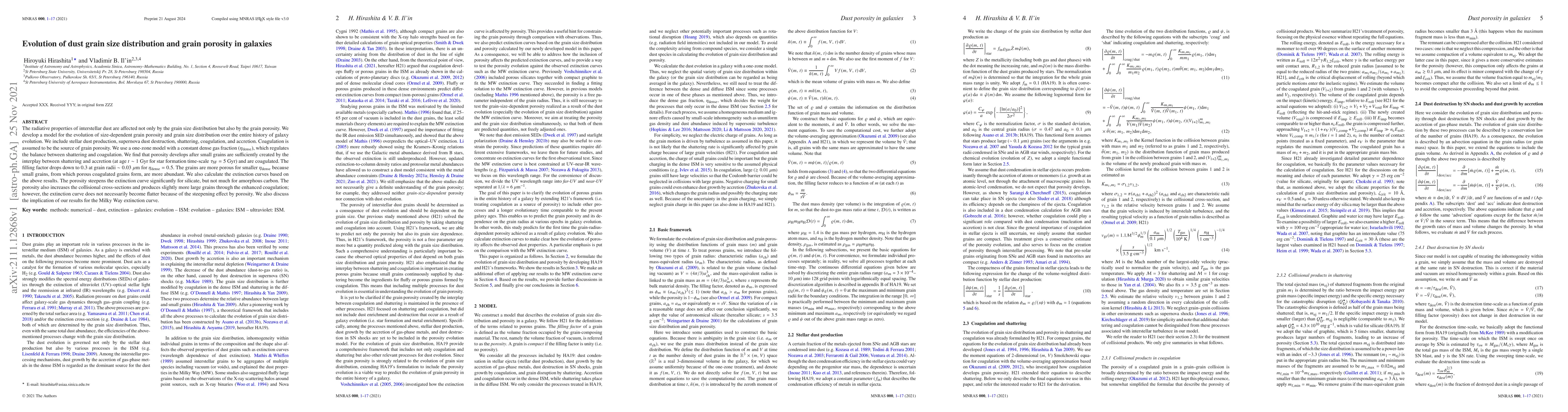 This paper develops a model to track the evolution of dust grain size distribution and porosity in galaxies, considering processes like stellar dust production, supernova destruction, and coagulation. It finds that porosity develops after small grains form and coagulate, significantly steepening the extinction curve for silicates but not for amorphous carbon.