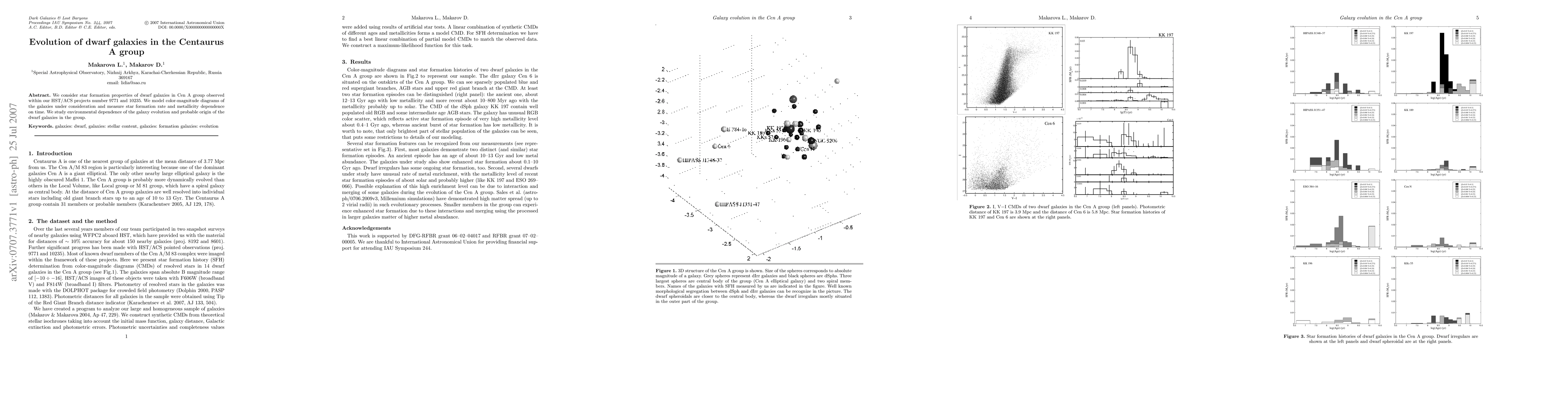 This paper investigates the star formation properties and evolution of dwarf galaxies in the Centaurus A group using HST/ACS observations, modeling their color-magnitude diagrams to assess star formation rates and metallicity over time, and explores the environmental influences on their development and origins.