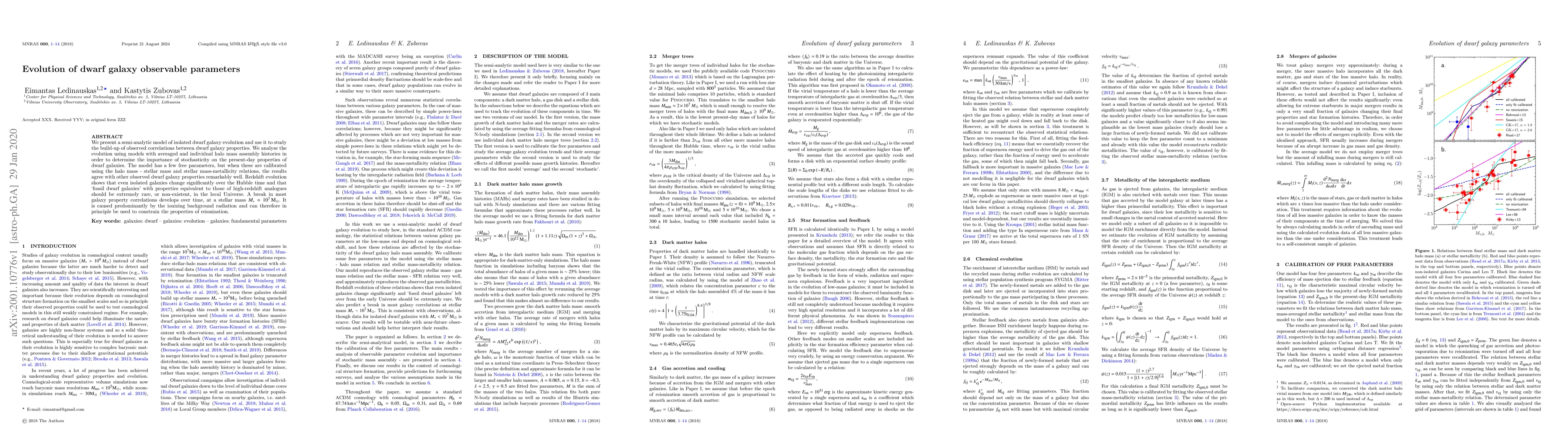 We present a semi-analytic model of isolated dwarf galaxy evolution and use it to study the build-up of observed correlations between dwarf galaxy properties. We analyse the evolution using models with averaged and individual halo mass assembly histories in order to determine the importance of stochasticity on the present-day properties of dwarf galaxies. The model has a few free parameters, but when these are calibrated using the halo mass - stellar mass and stellar mass-metallicity relations, the results agree with other observed dwarf galaxy properties remarkably well. Redshift evolution shows that even isolated galaxies change significantly over the Hubble time and that 'fossil dwarf galaxies' with properties equivalent to those of high-redshift analogues should be extremely rare, or non-existent, in the Local Universe. A break in most galaxy property correlations develops over time, at a stellar mass $M_* \simeq 10^7 M_\odot$. It is caused predominantly by the ionizing background radiation and can therefore in principle be used to constrain the properties of reionization.