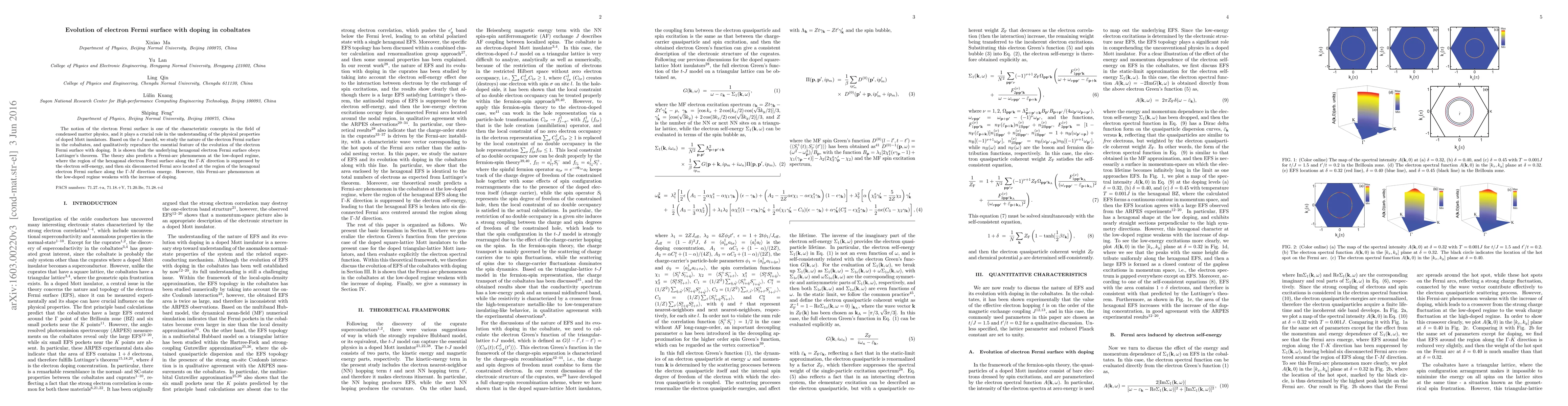 This paper investigates the evolution of the electron Fermi surface in cobaltates using the t-J model, revealing a hexagonal Fermi surface that adheres to Luttinger's theorem. It predicts a Fermi-arc phenomenon at low doping levels, characterized by suppressed regions along the \Gamma-K direction and the emergence of six disconnected Fermi arcs along the \Gamma-M direction, which diminishes with increased doping.