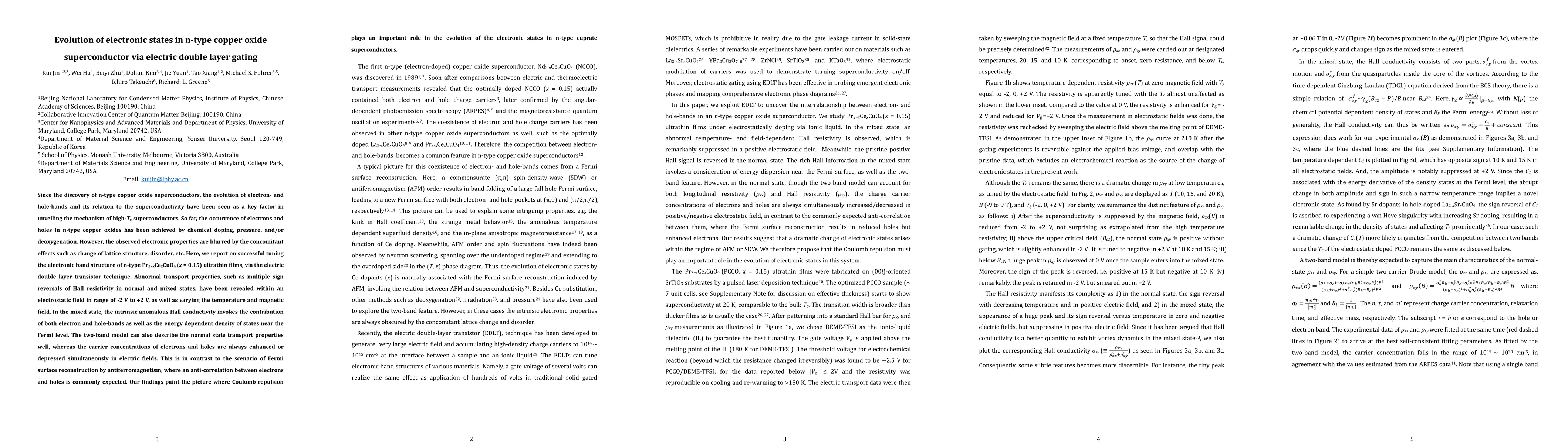 Since the discovery of n-type copper oxide superconductors, the evolution of electron- and hole-bands and its relation to the superconductivity have been seen as a key factor in unveiling the mechanism of high-Tc superconductors. So far, the occurrence of electrons and holes in n-type copper oxides has been achieved by chemical doping, pressure, and/or deoxygenation. However, the observed electronic properties are blurred by the concomitant effects such as change of lattice structure, disorder, etc. Here, we report on successful tuning the electronic band structure of n-type Pr2-xCexCuO4 (x = 0.15) ultrathin films, via the electric double layer transistor technique. Abnormal transport properties, such as multiple sign reversals of Hall resistivity in normal and mixed states, have been revealed within an electrostatic field in range of -2 V to +2 V, as well as varying the temperature and magnetic field. In the mixed state, the intrinsic anomalous Hall conductivity invokes the contribution of both electron and hole-bands as well as the energy dependent density of states near the Fermi level. The two-band model can also describe the normal state transport properties well, whereas the carrier concentrations of electrons and holes are always enhanced or depressed simultaneously in electric fields. This is in contrast to the scenario of Fermi surface reconstruction by antiferromagnetism, where an anti-correlation between electrons and holes is commonly expected. Our findings paint the picture where Coulomb repulsion plays an important role in the evolution of the electronic states in n-type cuprate superconductors.
