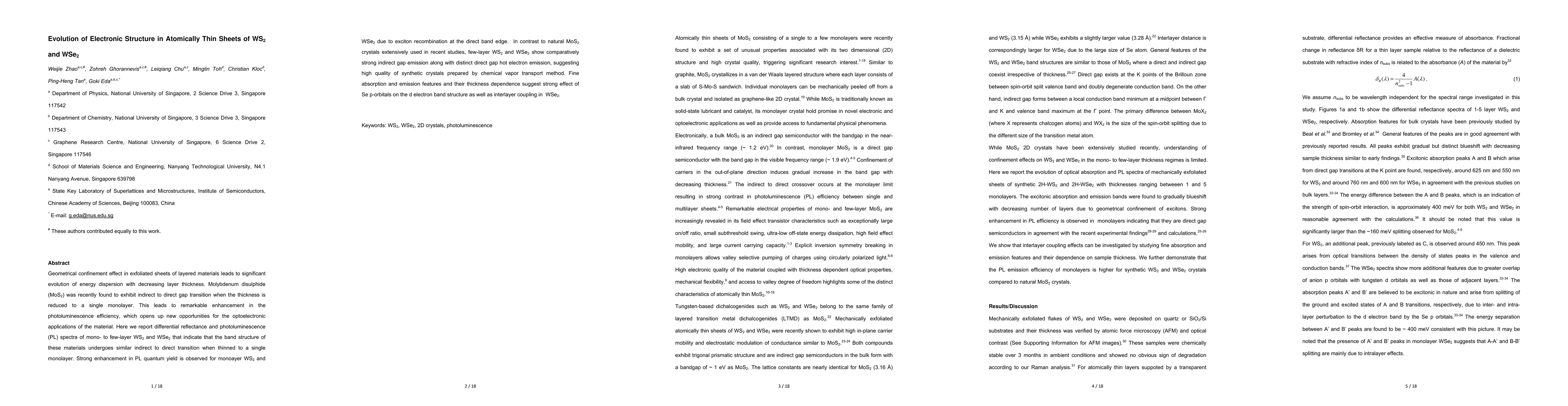 This study investigates the evolution of electronic structure in atomically thin WS2 and WSe2 sheets, revealing an indirect-to-direct bandgap transition when thinned to a single monolayer, accompanied by a significant enhancement in photoluminescence efficiency due to exciton recombination at the direct band edge. The high-quality synthetic crystals show distinct direct gap hot electron emission and a strong influence of Se p-orbitals on the material's electronic properties.
