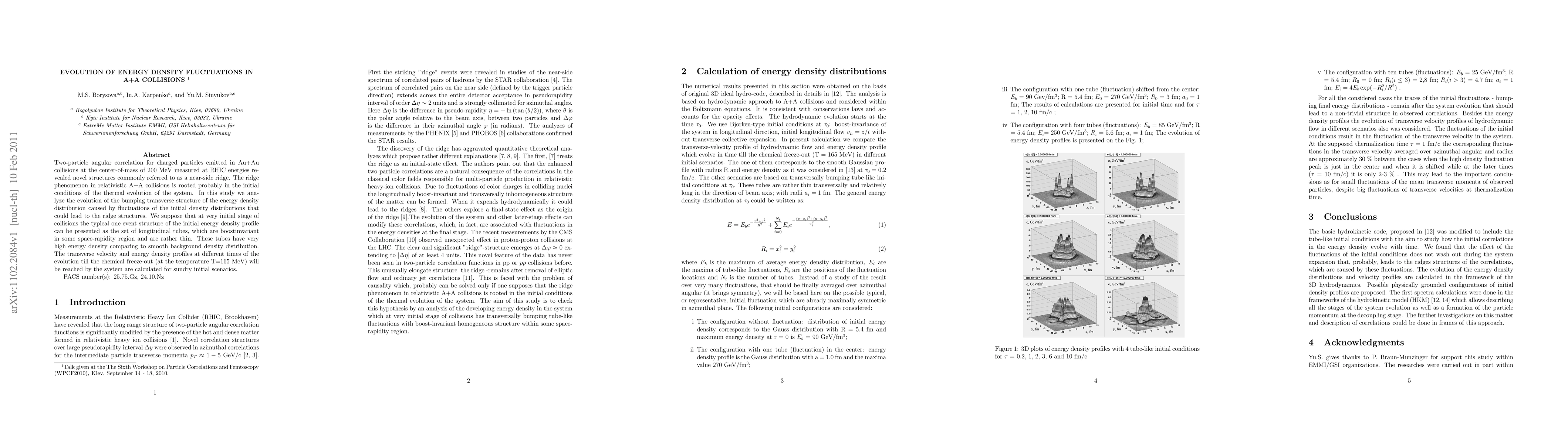Two-particle angular correlation for charged particles emitted in Au+Au collisions at the center-of-mass of 200 MeV measured at RHIC energies revealed novel structures commonly referred to as a near-side ridge. The ridge phenomenon in relativistic A+A collisions is rooted probably in the initial conditions of the thermal evolution of the system. In this study we analyze the evolution of the bumping transverse structure of the energy density distribution caused by fluctuations of the initial density distributions that could lead to the ridge structures. We suppose that at very initial stage of collisions the typical one-event structure of the initial energy density profile can be presented as the set of longitudinal tubes, which are boost-invariant in some space-rapidity region and are rather thin. These tubes have very high energy density comparing to smooth background density distribution. The transverse velocity and energy density profiles at different times of the evolution till the chemical freeze-out (at the temperature T=165 MeV) willbe reached by the system are calculated for sundry initial scenarios.