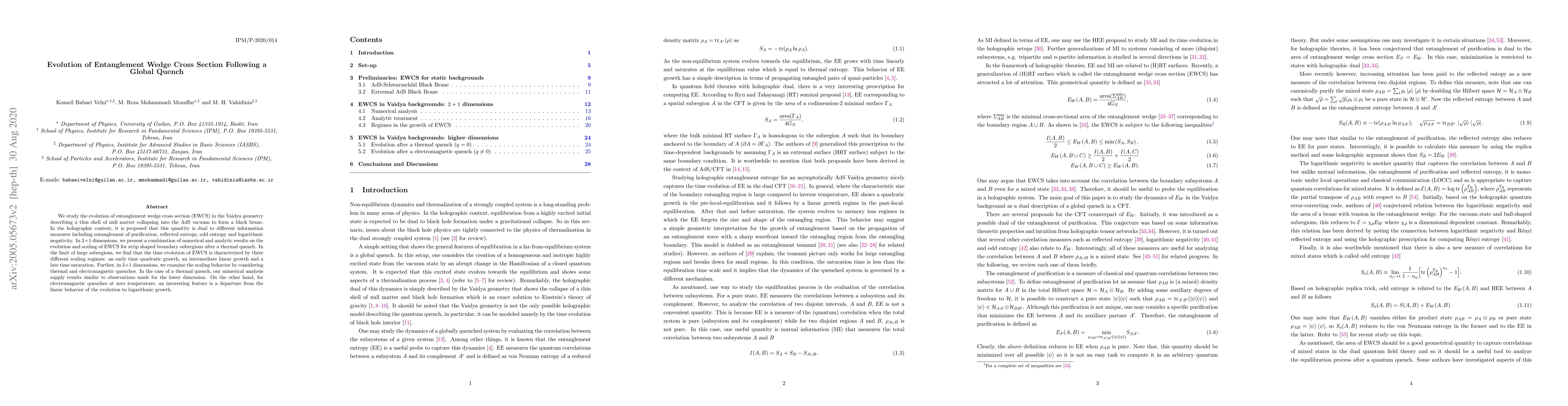 The paper studies how entanglement wedges cross sections change over time after a global quench in different dimensions, finding three scaling regimes in 2+1 dimensions and logarithmic growth in certain cases.