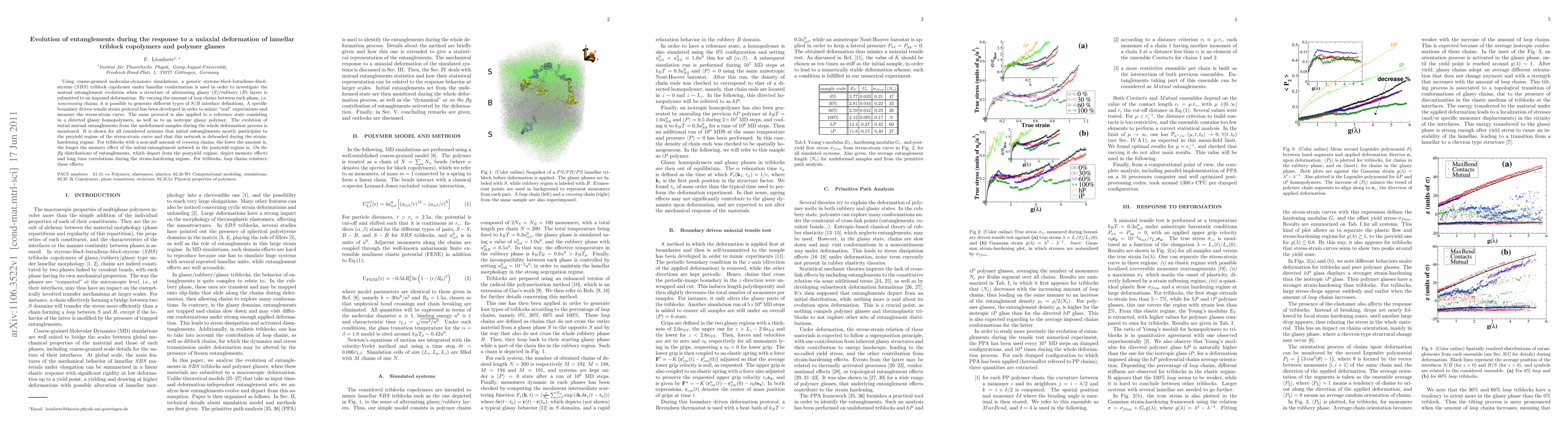 Using coarse-grained molecular-dynamics simulations, a generic styrene-(block)-butadiene-(block)-styrene (SBS) triblock copolymer under lamellar conformation is used in order to investigate the mutual entanglement evolution when a structure of alternating glassy (S)/rubbery (B) layers is submitted to an imposed deformation. By varying the amount of loop chains between each phase, i.e. noncrossing chains, it is possible to generate different types of S/B interface definitions. A specific boundary driven tensile strain protocol has been developed in order to mimic "real" experiments and measure the stress-strain curve. The same protocol is also applied to a reference state consisting in a directed glassy homopolymers, as well as to an isotropic glassy polymer. The evolution of initial mutual entanglements from the undeformed samples during the whole deformation process is monitored. It is shown for all considered systems that initial entanglements mostly participate to the preyield regime of the stress-strain curve and that this network is debonded during the strain-hardening regime. For triblocks with a non-null amount of crossing chains, the lower the amount is, the longer the memory effect of the initial entanglement network in the postyield regime is. On the fly distributions of entanglements, which depart from the postyield regime, depict memory effects and long time correlations during the strain-hardening regime. For triblocks, loop chains reinforce these effects.