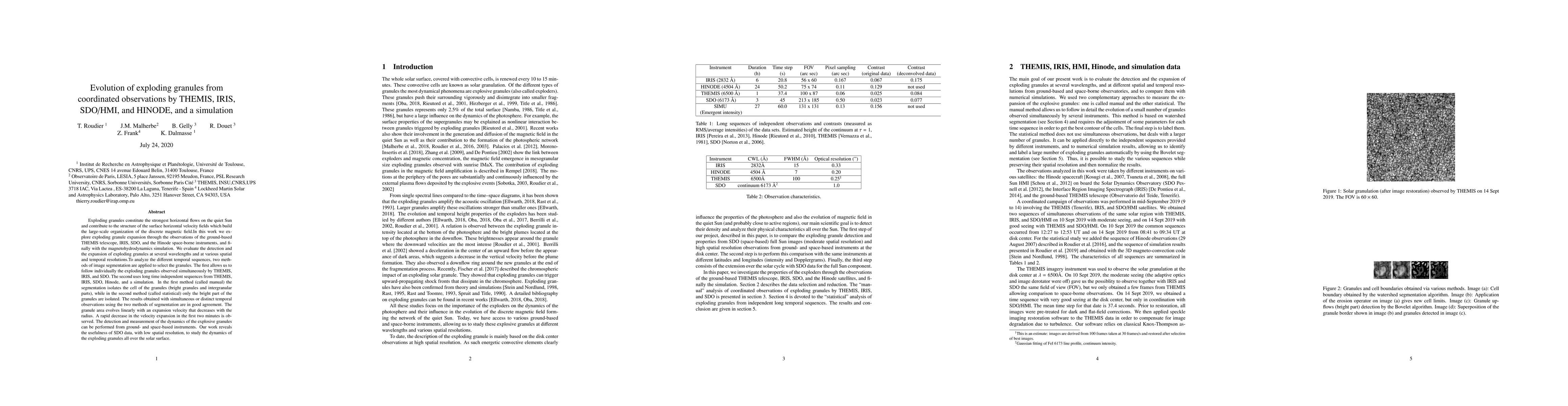 This paper investigates the dynamics of exploding granules on the quiet Sun using coordinated observations from THEMIS, IRIS, SDO, and Hinode, alongside a magnetohydrodynamics simulation. The study reveals that these granules expand linearly with a velocity that decreases with radius, showing a rapid deceleration in the first two minutes. Both ground- and space-based instruments are effective for detecting and measuring these granules, highlighting the utility of SDO data for large-scale studies.