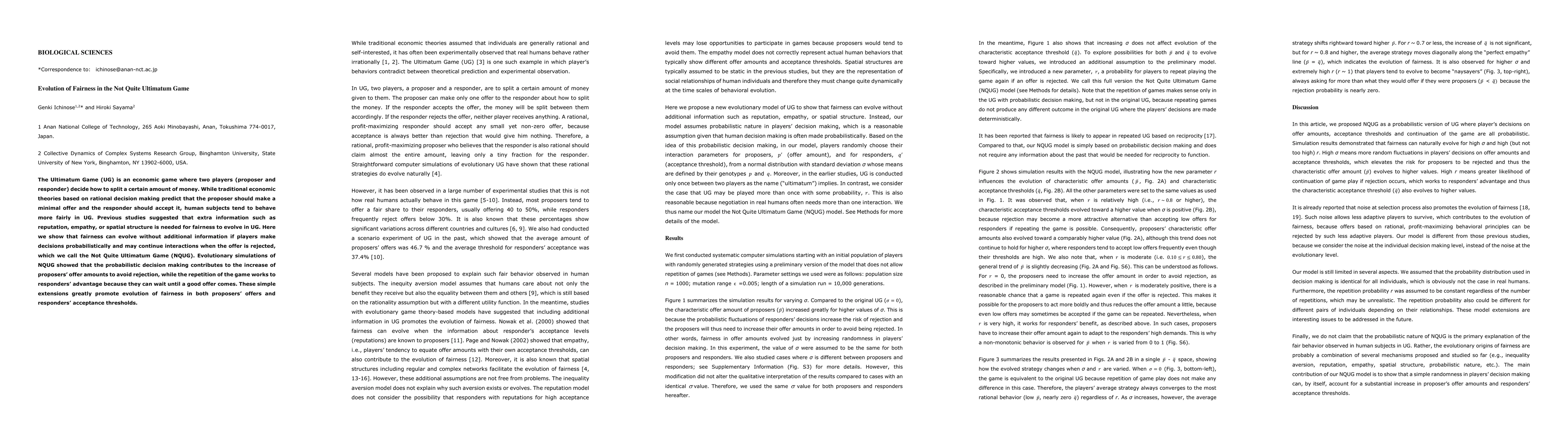 This study demonstrates that fairness in the Not Quite Ultimatum Game (NQUG) can evolve without additional information if players make probabilistic decisions and continue interactions after rejections. Evolutionary simulations show that proposers increase offer amounts to avoid rejection, while responders benefit from waiting for better offers.