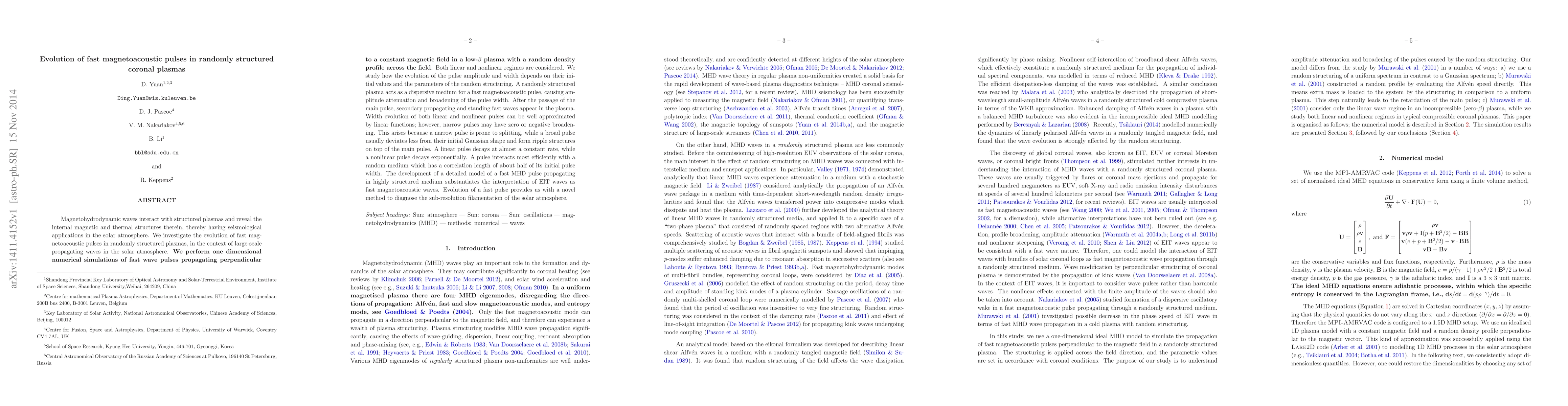 This paper investigates the evolution of fast magnetoacoustic pulses in randomly structured coronal plasmas, using numerical simulations to explore how the pulse's amplitude and width change under different initial conditions and plasma structuring parameters. The study reveals that narrow pulses may split, while broad pulses maintain their shape, leading to different decay rates and the emergence of secondary waves.