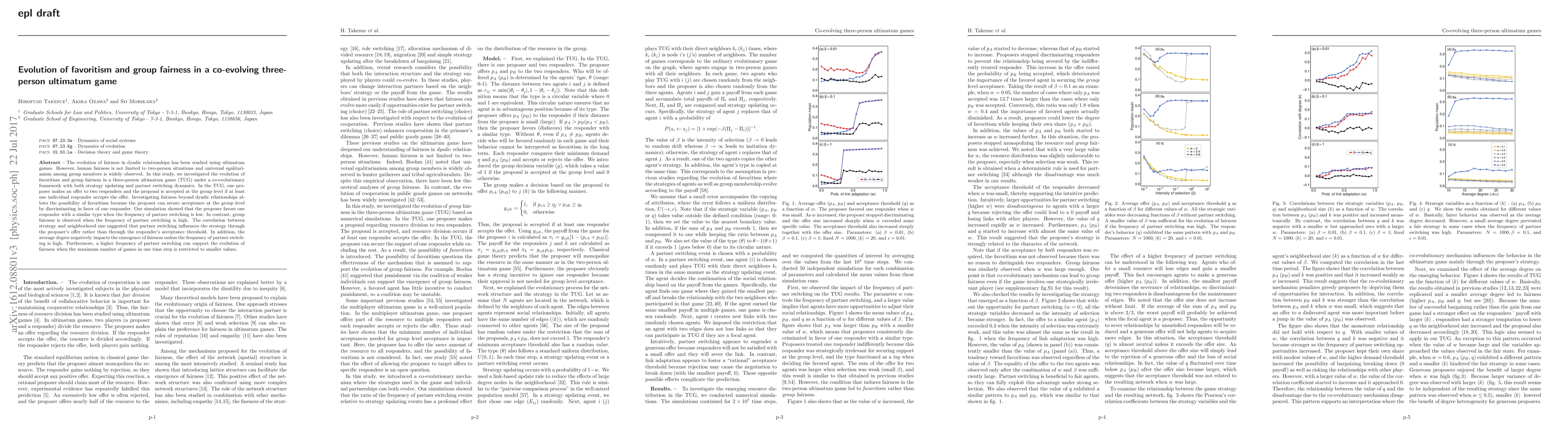 This study explores the evolution of favoritism and group fairness in a three-person ultimatum game under co-evolutionary dynamics, revealing that low partner switching favors individual discrimination, while high switching promotes group fairness. The findings suggest that partner switching influences proposer strategies more than responder acceptance thresholds.