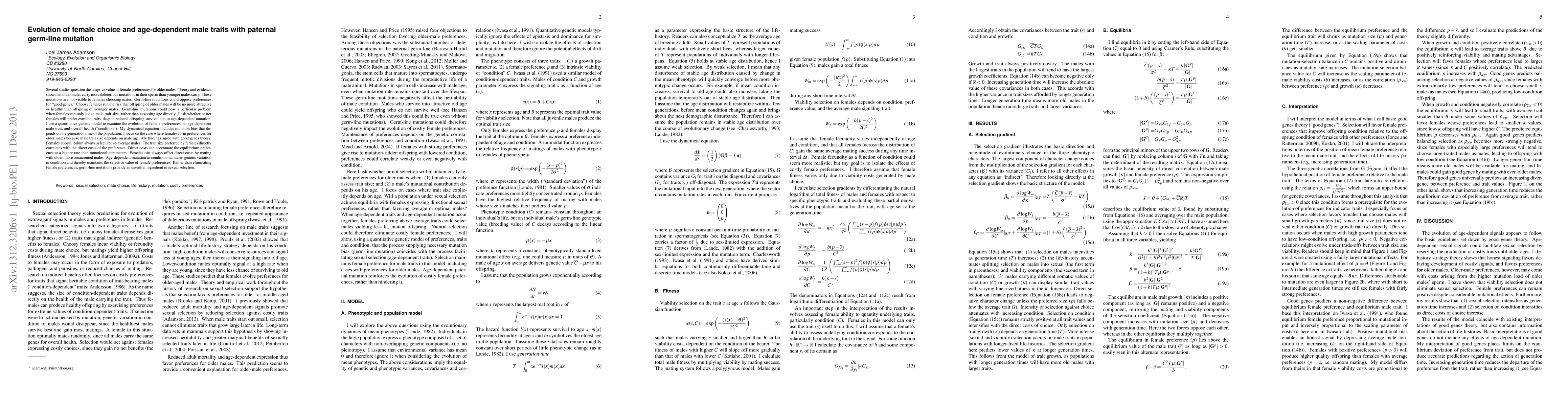 This paper explores the interplay between female mate choice and paternal germ-line mutations, finding that despite older males carrying more deleterious mutations, females still prefer older males due to their "good genes." Female preferences evolve to balance direct costs and maintain genetic variation, sustaining the selective value of mate choice.