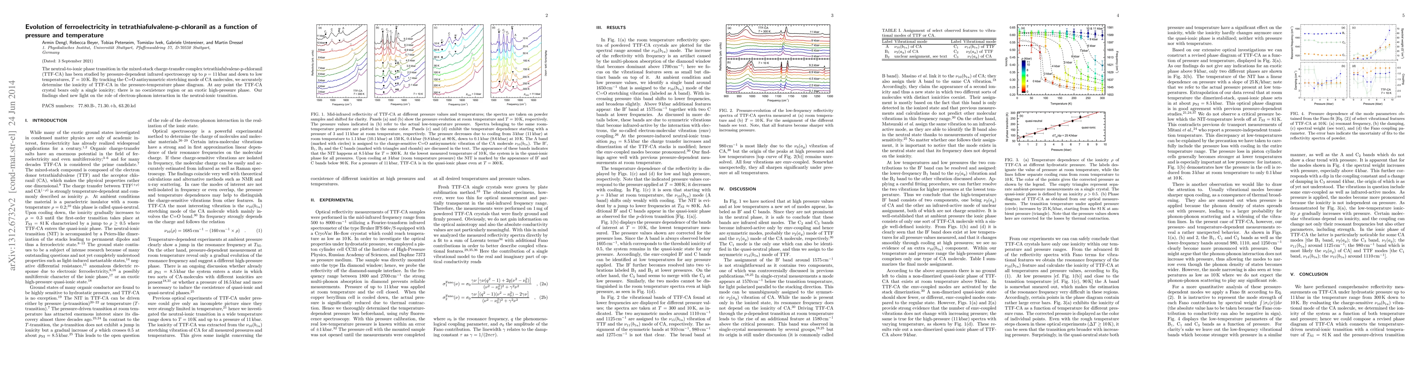 This study investigates the neutral-to-ionic phase transition in tetrathiafulvalene-p-chloranil (TTF-CA) using pressure-dependent infrared spectroscopy, revealing a single ionicity without coexistence regions. The research highlights the influence of electron-phonon interactions on the transition under varying pressure and temperature conditions.