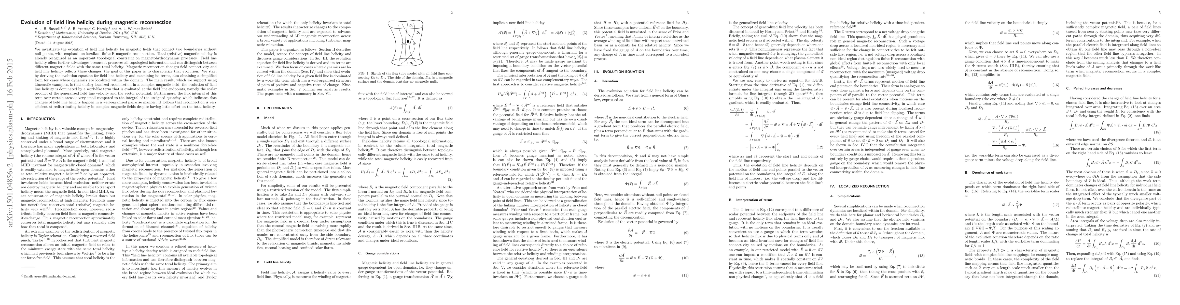 This paper investigates the evolution of field line helicity during magnetic reconnection, showing that localized reconnection primarily redistributes helicity in a well-organized pairwise manner, while having minimal effect on total helicity. The study derives an evolution equation for field line helicity and finds that reconnection is efficient at redistributing helicity despite preserving total helicity.