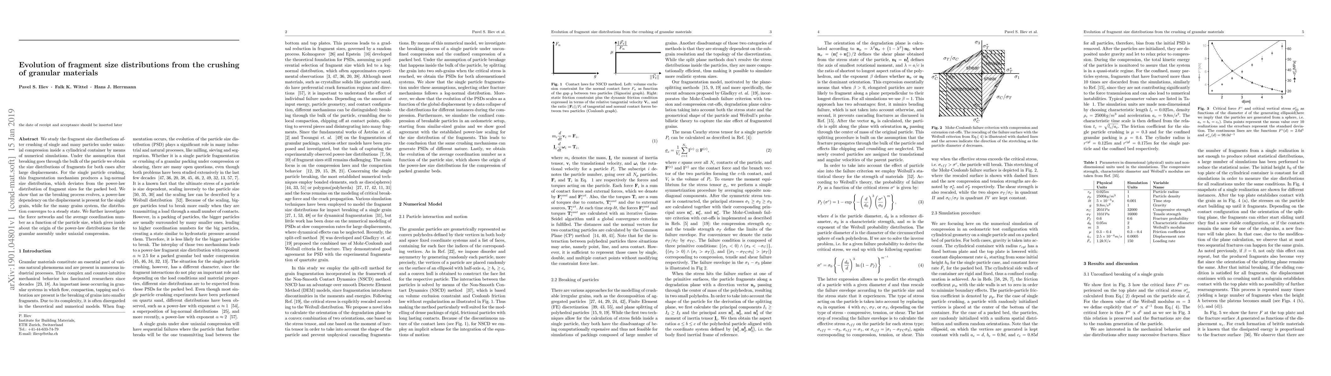 This research investigates the fragment size distributions from crushing granular materials through numerical simulations, revealing a log-normal distribution for single particles and a power-law distribution for packed beds. The study also explores the evolution of these distributions and the underlying force networks influencing fragmentation.