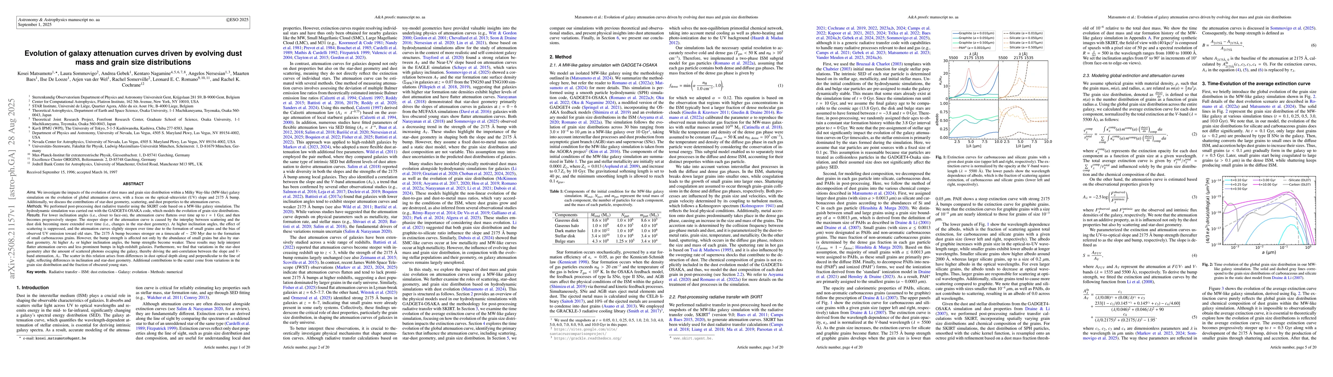 We investigate the impacts of the evolution of dust mass and grain size distribution within a Milky Way-like (MW-like) galaxy simulation on global attenuation curves, focusing on the optical-UV slope and the 2175 $AA$ bump. We discuss the contributions of star-dust geometry, scattering, and dust properties. Post-processing dust radiative transfer was performed using SKIRT based on the MW-like galaxy simulation. The simulation was carried out with GADGET4-OSAKA, which models the evolution of grain size distributions. For lower inclination angles (closer to face-on), the attenuation curve flattens over time up to t=1 Gyr, then becomes progressively steeper. This steeper slope arises from the interplay between scattering and the dust disk becoming more extended over time (changes in star-dust geometry). At higher inclination, scattering is suppressed, and the attenuation curves slightly steepen over time due to small-grain formation and the bias of observed UV light toward older stars. The bump strengthens on a timescale of ~250 Myr due to the formation of small carbonaceous grains. The bump strength is affected not only by the abundance of small grains but also by star-dust geometry. At higher $A_V$ or higher inclination, the bump weakens. These results may help interpret flatter attenuation curves and weaker bumps in high-redshift galaxies. Variations in star-dust geometry alter the amount of scattered photons escaping the galaxy, driving the anti-correlation between the slope and $A_V$. Scatter in this relation arises from differences in dust optical depth along and perpendicular to the line of sight, reflecting inclination and star-dust geometry. Additional contributions come from variations in grain size distribution and the fraction of obscured young stars.