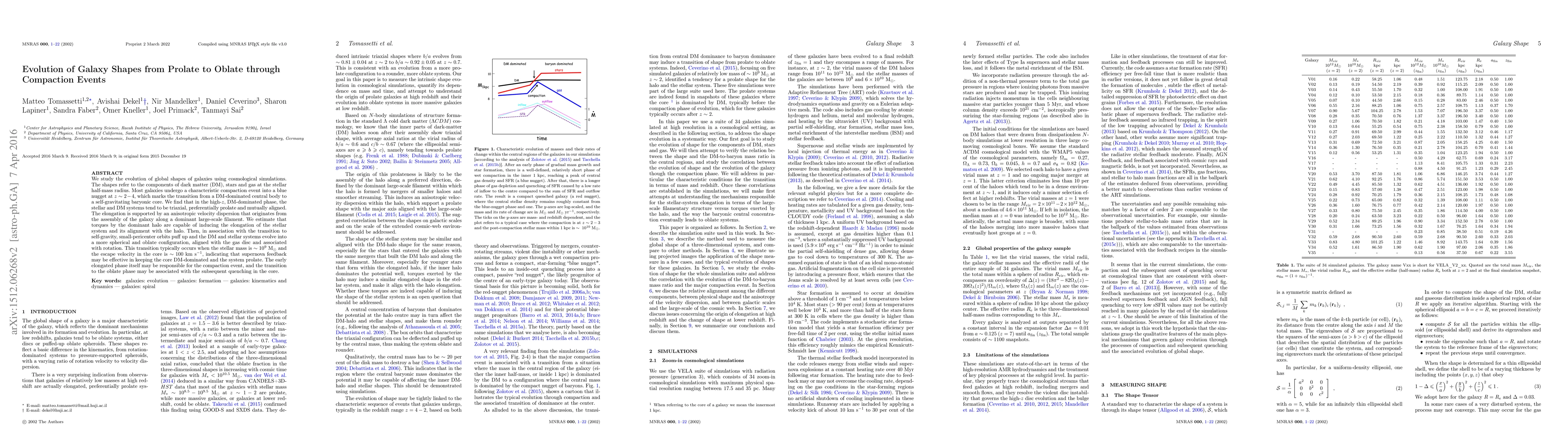 This study uses cosmological simulations to track the evolution of galaxy shapes from prolate to oblate, finding that galaxies undergo a compaction event into a self-gravitating baryonic core at high redshifts. Initially, galaxies are triaxial and prolate, transitioning to a more spherical and oblate configuration as they evolve.