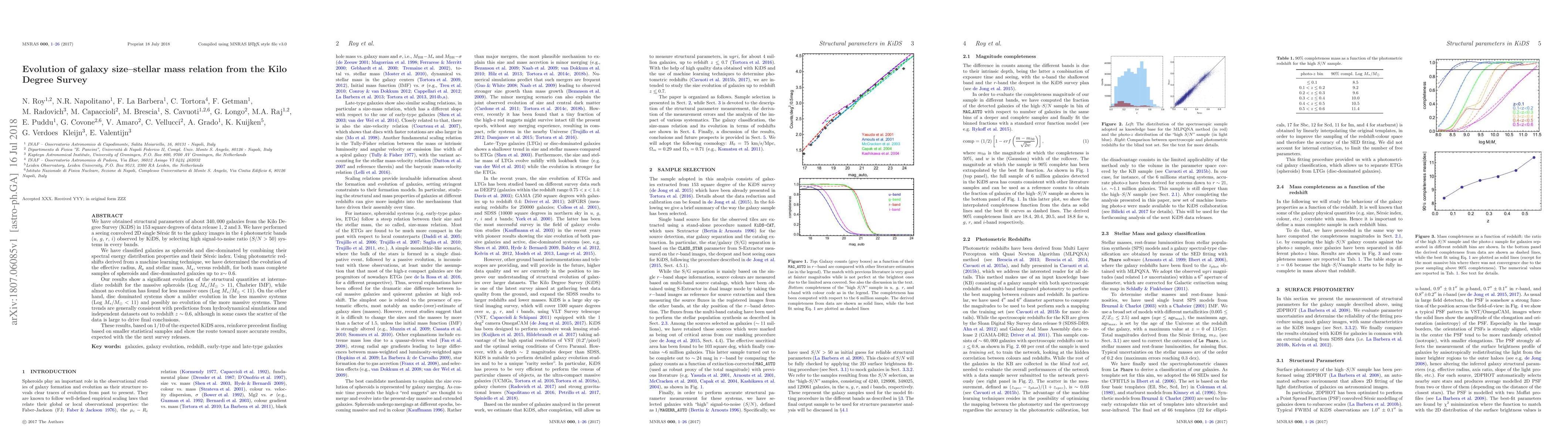 We have obtained structural parameters of about 340,000 galaxies from the Kilo Degree Survey (KiDS) in 153 square degrees of data release 1, 2 and 3. We have performed a seeing convolved 2D single S\'ersic fit to the galaxy images in the 4 photometric bands (u, g, r, i) observed by KiDS, by selecting high signal-to-noise ratio (S/N > 50) systems in every bands. We have classified galaxies as spheroids and disc-dominated by combining their spectral energy distribution properties and their S\'ersic index. Using photometric redshifts derived from a machine learning technique, we have determined the evolution of the effective radius, \Re\ and stellar mass, \mst, versus redshift, for both mass complete samples of spheroids and disc-dominated galaxies up to z ~ 0.6. Our results show a significant evolution of the structural quantities at intermediate redshift for the massive spheroids ($\mbox{Log}\ M_*/M_\odot>11$, Chabrier IMF), while almost no evolution has found for less massive ones ($\mbox{Log}\ M_*/M_\odot < 11$). On the other hand, disc dominated systems show a milder evolution in the less massive systems ($\mbox{Log}\ M_*/M_\odot < 11$) and possibly no evolution of the more massive systems. These trends are generally consistent with predictions from hydrodynamical simulations and independent datasets out to redshift z ~ 0.6, although in some cases the scatter of the data is large to drive final conclusions. These results, based on 1/10 of the expected KiDS area, reinforce precedent finding based on smaller statistical samples and show the route toward more accurate results, expected with the the next survey releases.