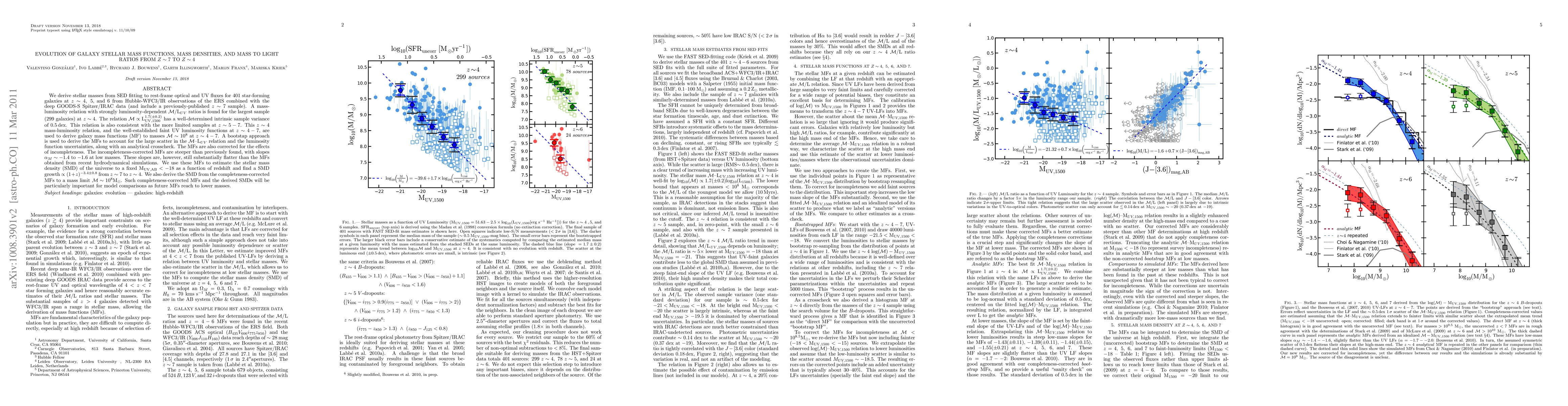This paper analyzes stellar masses and mass functions for 401 star-forming galaxies at z 4-7, finding a mass-luminosity relation and deriving galaxy mass functions that are steeper than previously reported. The study estimates the stellar mass density growth from z 7 to z 4, showing a significant decline in density with increasing redshift.
