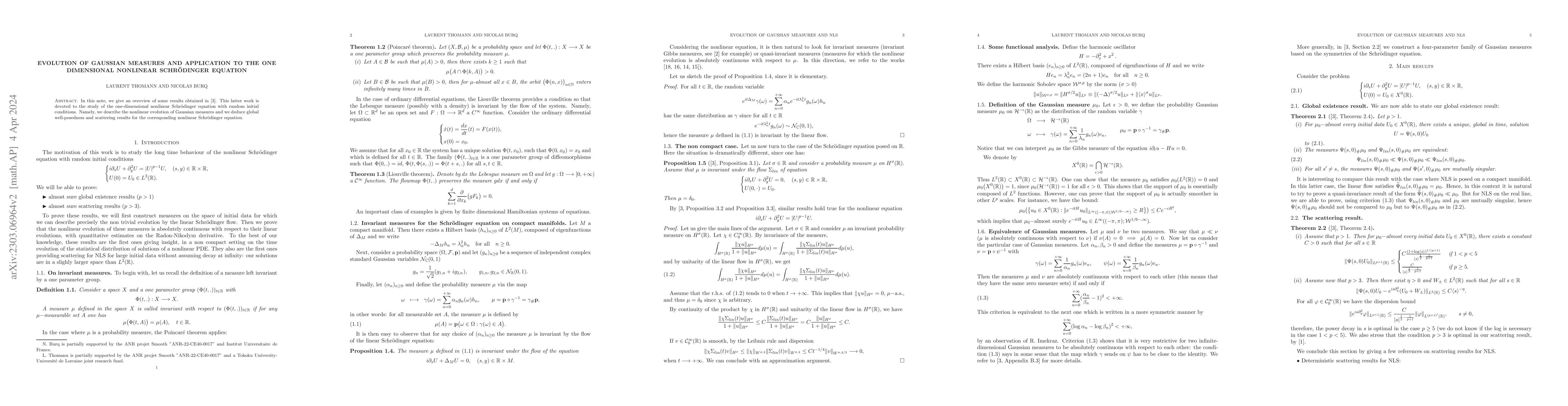 This paper reviews findings from a study on the one-dimensional nonlinear Schrödinger equation with random initial conditions, focusing on the evolution of Gaussian measures and deriving global well-posedness and scattering results.