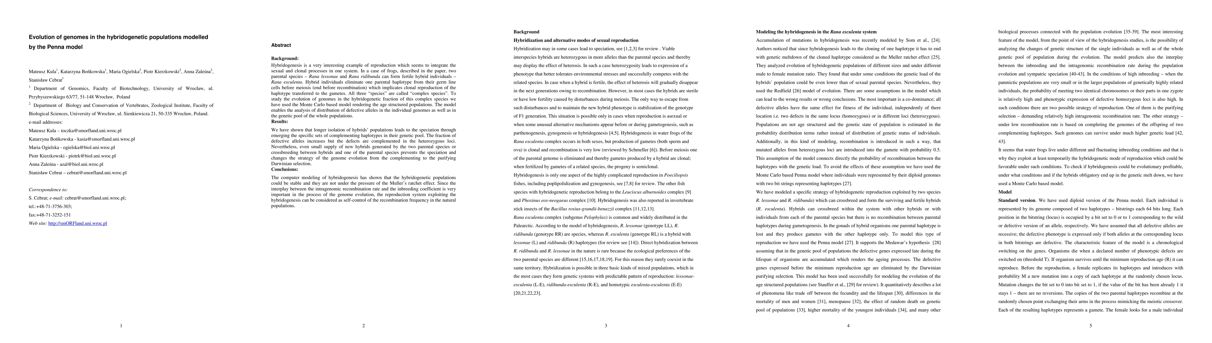 This paper uses the Penna model to study the evolution of genomes in hybridogenetic frog populations, specifically focusing on the complex species formed by Rana lessonae, Rana ridibunda, and their hybrid Rana esculenta. The results show that prolonged isolation leads to speciation through the emergence of specific haplotypes, while the introduction of new hybrids shifts genome evolution towards purifying selection.