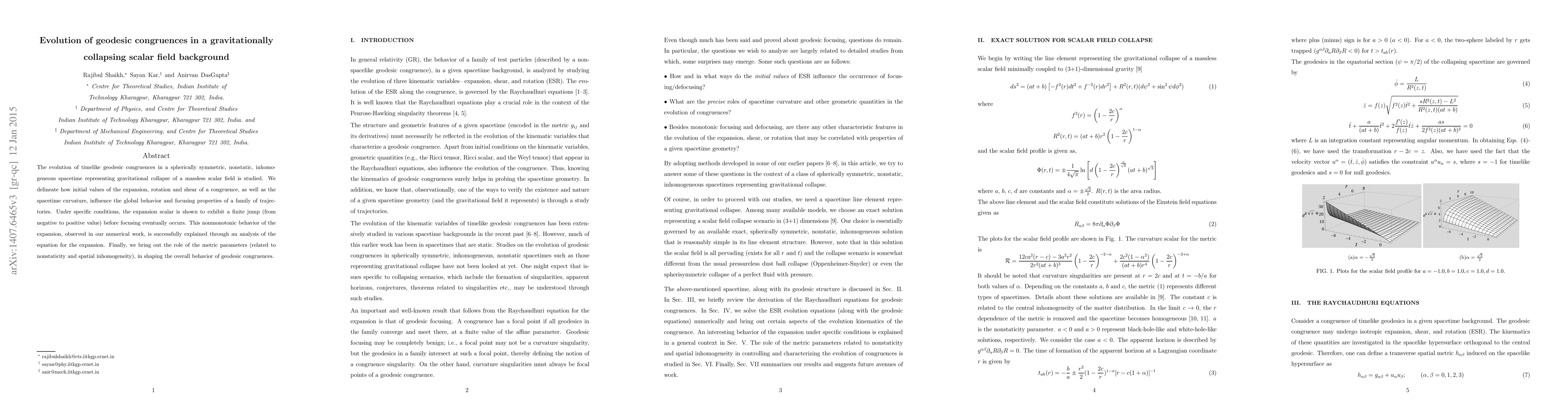 The evolution of timelike geodesic congruences in a spherically symmetric, nonstatic, inhomogeneous spacetime representing gravitational collapse of a massless scalar field is studied. We delineate how initial values of the expansion, rotation and shear of a congruence, as well as the spacetime curvature, influence the global behavior and focusing properties of a family of trajectories. Under specific conditions, the expansion scalar is shown to exhibit a finite jump (from negative to positive value) before focusing eventually occurs. This nonmonotonic behavior of the expansion, observed in our numerical work, is successfully explained through an analysis of the equation for the expansion. Finally, we bring out the role of the metric parameters (related to nonstaticity and spatial inhomogeneity), in shaping the overall behavior of geodesic congruences.