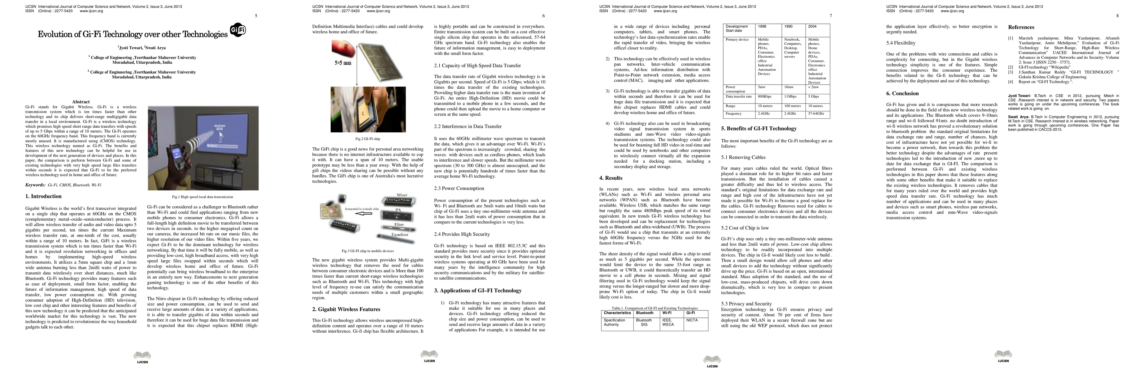 Gi-Fi stands for Gigabit Wireless. Gi-Fi is a wireless transmission system which is ten times faster than other technology and its chip delivers short-range multigigabit data transfer in a local environment. Gi-Fi is a wireless technology which promises high speed short range data transfers with speeds of up to 5 Gbps within a range of 10 meters. The Gi-Fi operates on the 60GHz frequency band. This frequency band is currently mostly unused. It is manufactured using (CMOS) technology. This wireless technology named as Gi-Fi. The benefits and features of this new technology can be helpful for use in development of the next generation of devices and places. In this paper, the comparison is perform between Gi-Fi and some of existing technologies with very high speed large files transfers within seconds it is expected that Gi-Fi to be the preferred wireless technology used in home and office of future.