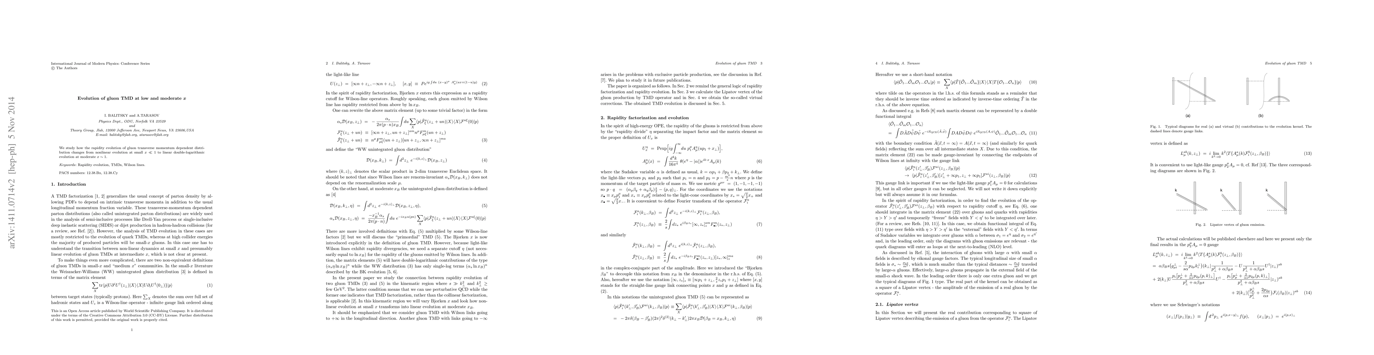 Summary: This paper investigates the transition in the rapidity evolution of gluon transverse momentum dependent distributions from nonlinear dynamics at very low $x$ to linear double-logarithmic evolution at moderate $x$. The study focuses on the behavior of gluons in the context of small and moderate values of $x$.