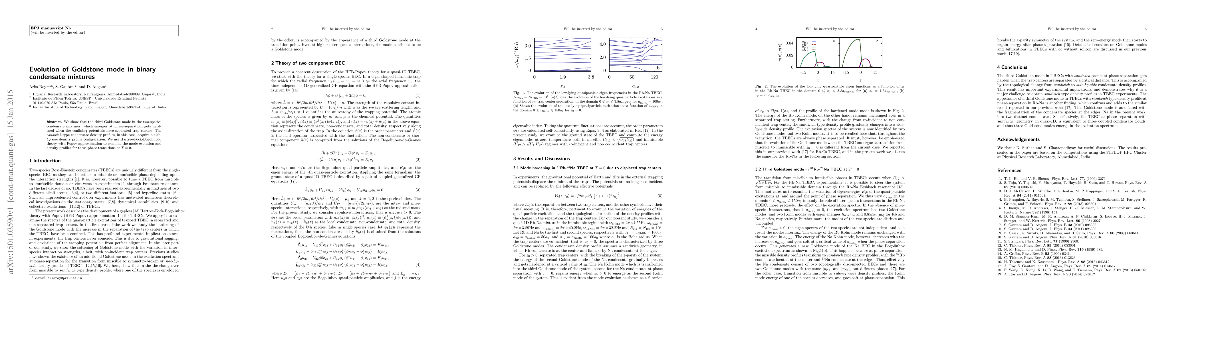 We show that the third Goldstone mode in the two-species condensate mixtures, which emerges at phase-separation, gets hardened when the confining potentials have separated trap centers. The {\em sandwich} type condensate density profiles, in this case, acquire a {\em side-by-side} density profile configuration. We use Hartree-Fock-Bogoliubov theory with Popov approximation to examine the mode evolution and density profiles for these phase transitions at $T=0$.