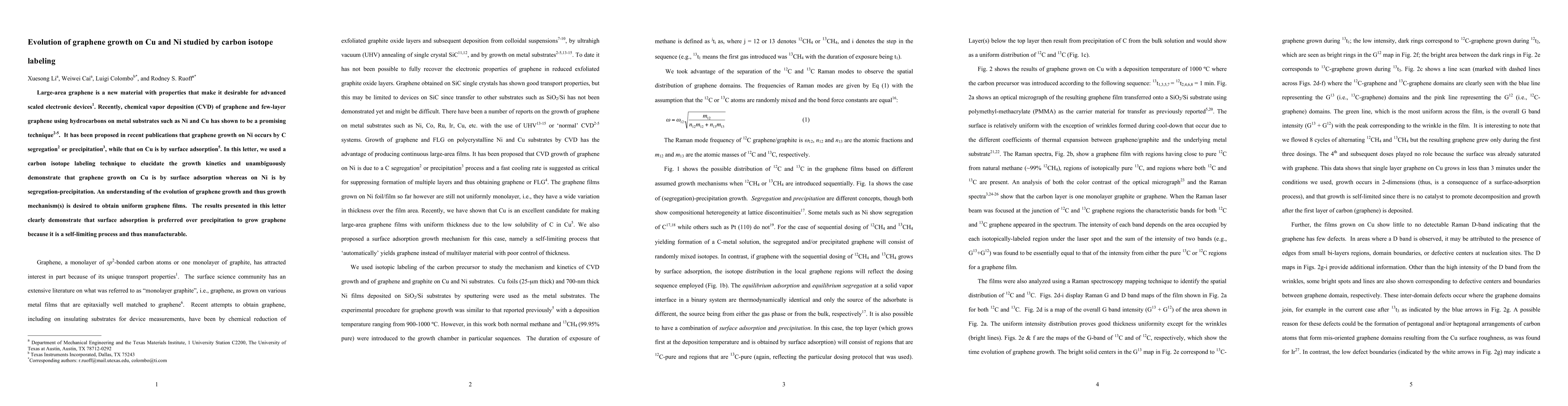 This research uses carbon isotope labeling to clarify graphene growth mechanisms on Cu and Ni substrates, revealing that graphene grows via surface adsorption on Cu and segregation-precipitation on Ni. This understanding aids in achieving uniform graphene films for electronic applications.
