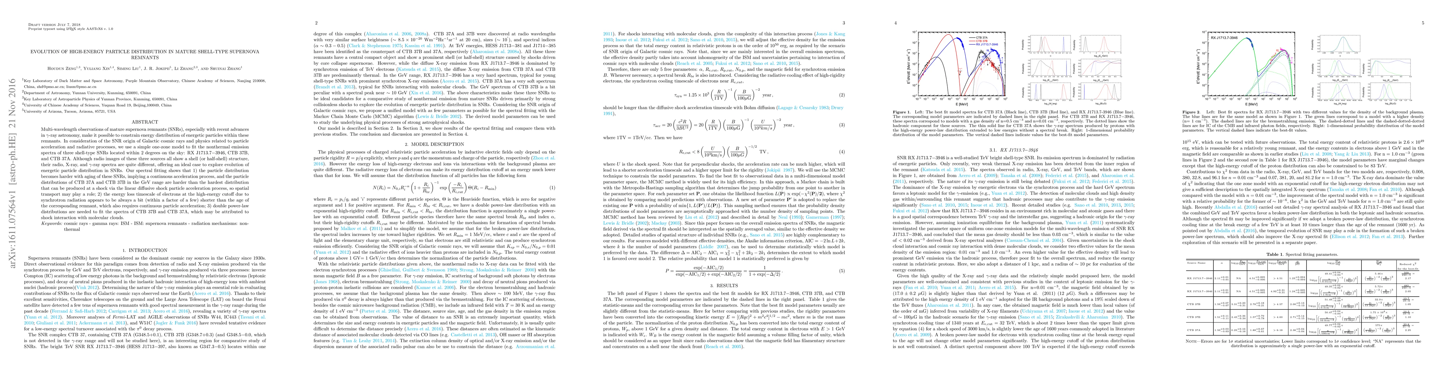 Research on mature shell-type supernova remnants reveals that energetic particle distributions become harder with age, requiring continuous acceleration and potentially spatial transport, and may be influenced by interactions with molecular clouds.