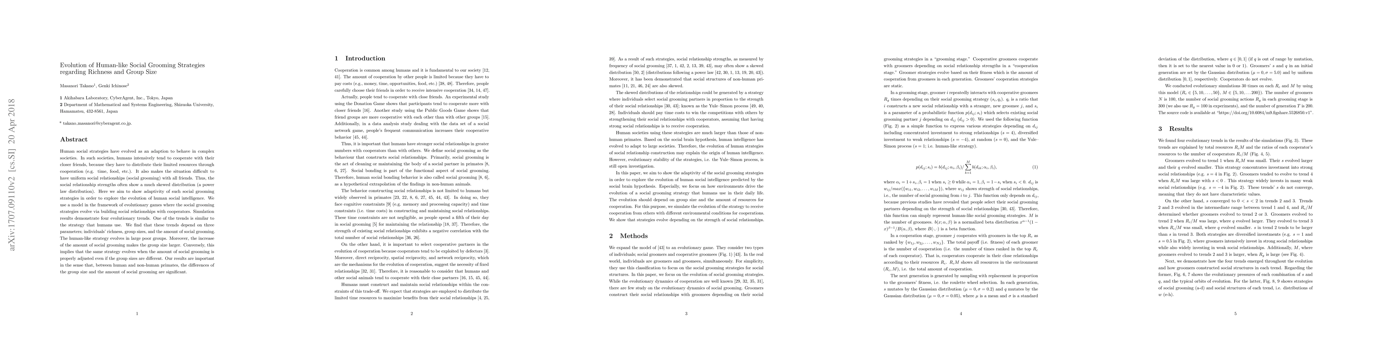 Human beings tend to cooperate with close friends, therefore they have to construct strong social relationships to recieve cooperation from others. Therefore they should have acquired their strategies of social relationship construction through an evolutionary process. The behavior of social relationship construction is know as "social grooming." In this paper, we show that there are four classes including a human-like strategy in evolutionary dynamics of social grooming strategies based on an evolutionary game simulation. Social relationship strengths (as measured by frequency of social grooming) often show a much skewed distribution (a power law distribution). It may be due to time costs constraints on social grooming, because the costs are too large to ignore for having many strong social relationships. Evolution of humans' strategies of construction of social relationships may explain the origin of human intelligence based on a social brain hypothesis. We constructed an individual-based model to explore the evolutionary dynamics of social grooming strategies. The model is based on behavior to win over others by strengthening social relationships with cooperators. The results of evolutionary simulations show the four classes of evolutionary dynamics. The results depend on total resources and the ratio of each cooperator's resource to the number of cooperators. One of the four classes is similar to a human strategy, i.e. the strategies based on the Yule--Simon process of power law.