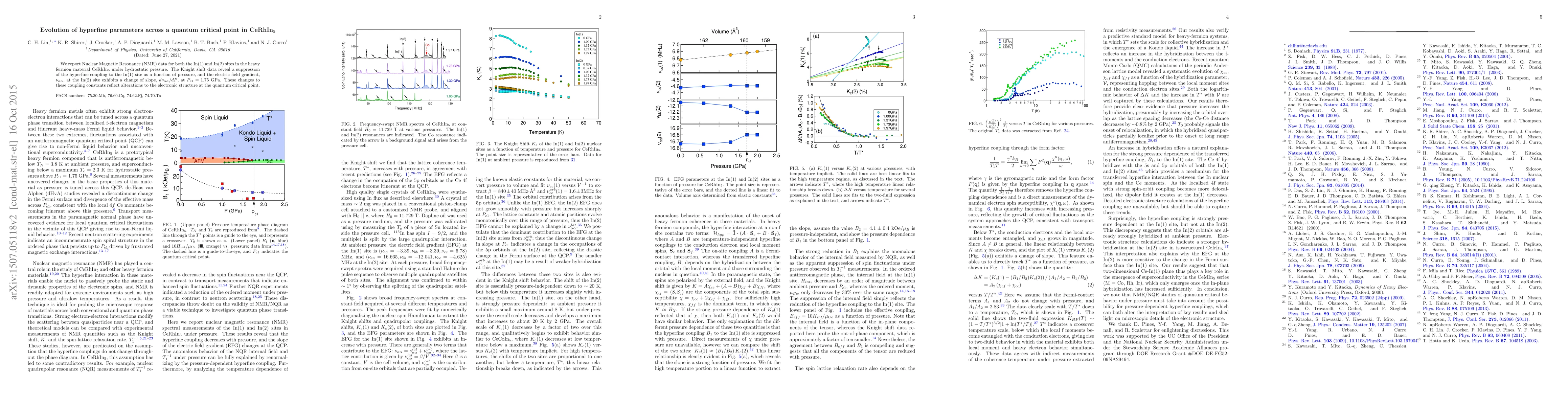 We report Nuclear Magnetic Resonance (NMR) data for both the In(1) and In(2) sites in the heavy fermion material CeRhIn$_5$ under hydrostatic pressure. The Knight shift data reveal a suppression of the hyperfine coupling to the In(1) site as a function of pressure, and the electric field gradient, $\nu_{\alpha\alpha}$, at the In(2) site exhibits a change of slope, $d\nu_{\alpha\alpha}/dP$, at $P_{c1} = 1.75$ GPa. These changes to these coupling constants reflect alterations to the electronic structure at the quantum critical point.
